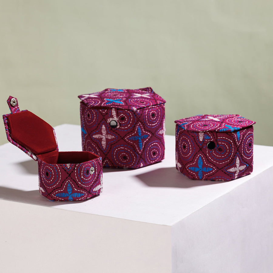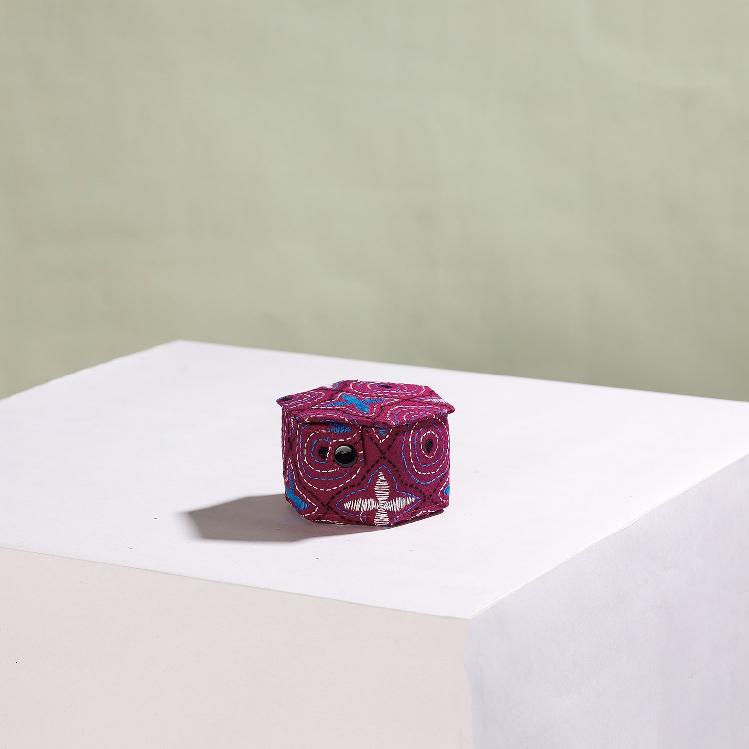 Fine quality, purple handcrafted Kantha-work jewellery storage boxes from West Bengal. Made from hardboard, the box is lined with kantha-work fabric outside and soft velvet inside. It has ample space to keep most of your jewellery or other small utility items, and it protects your beloved jewellery from scratch and dust.