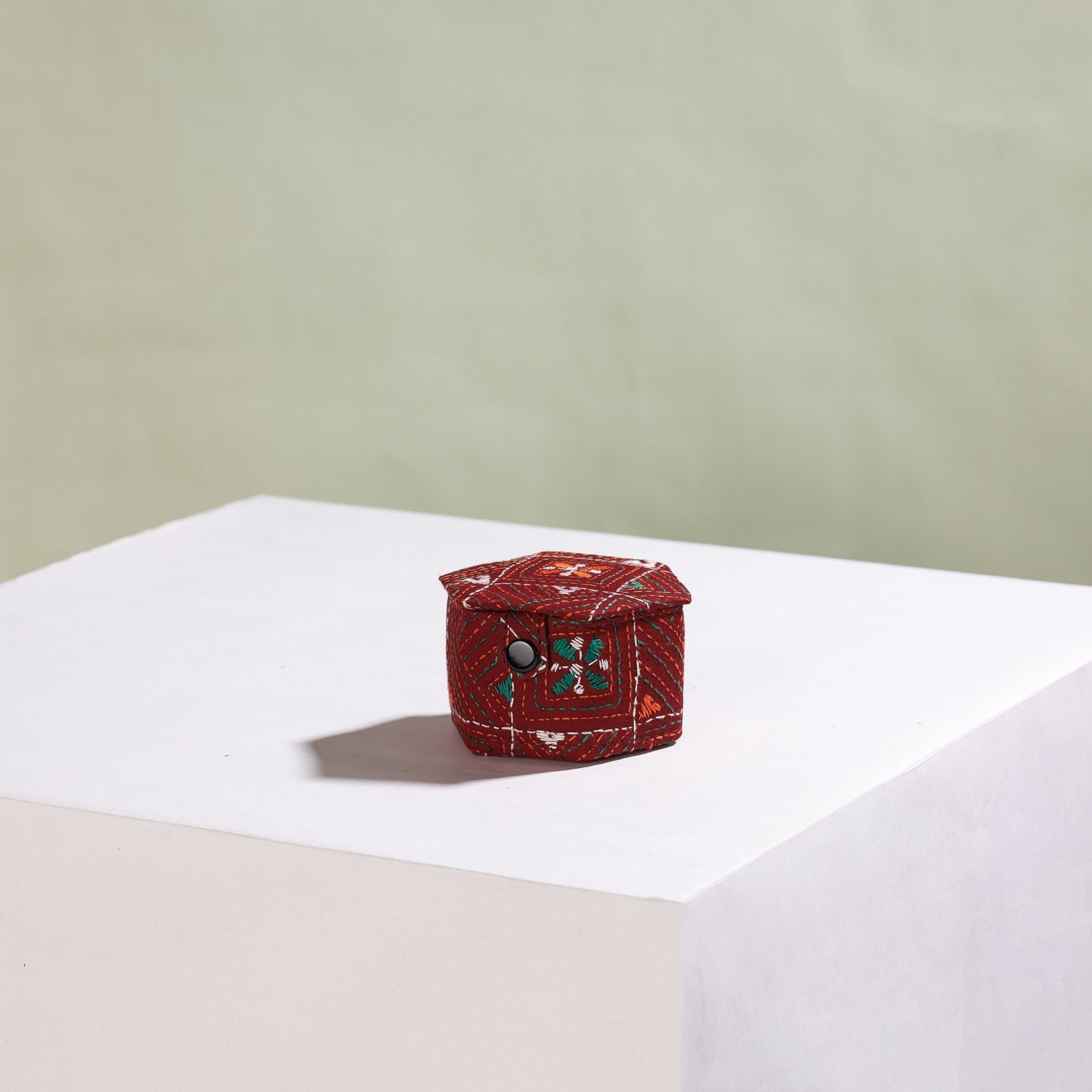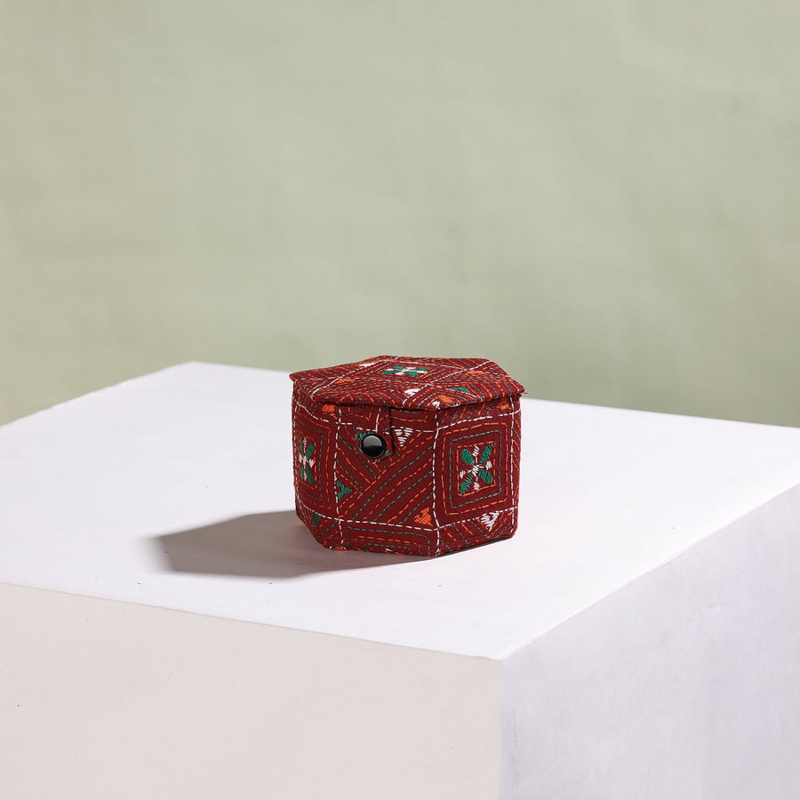| Material | Fine quality, red handcrafted Kantha-work jewellery storage boxes from West Bengal. Made from hardboard, the box is lined with kantha-work fabric outside and soft velvet inside. It has ample space to keep most of your jewellery or other small utility items, and it protects your beloved jewellery from scratch and dust. |