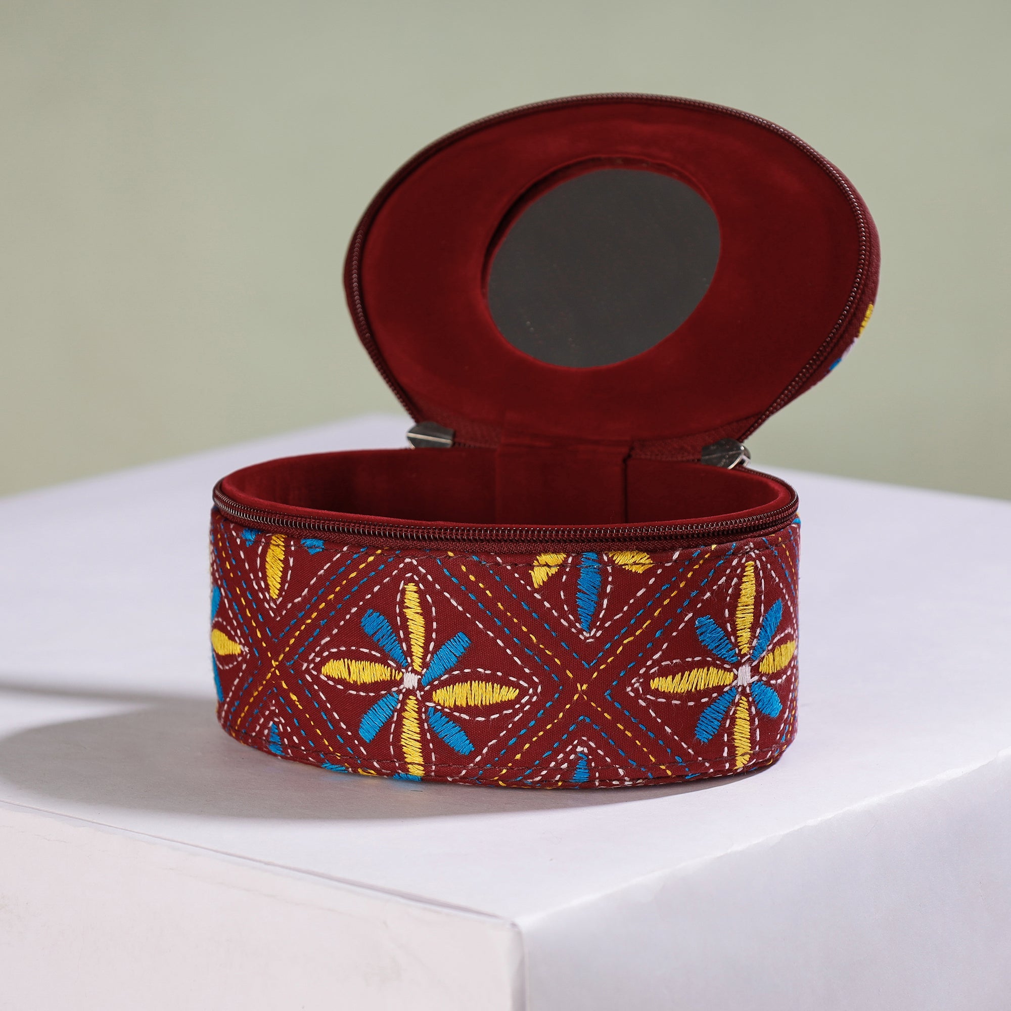 | Material | Fine quality maroon kantha work handcrafted jewelry storage box from West Bengal. Made from millboard, the box is lined with kantha work fabric outside & soft velvet with small mirror inside. It protect your beloved jewelry from scratch and dust. |