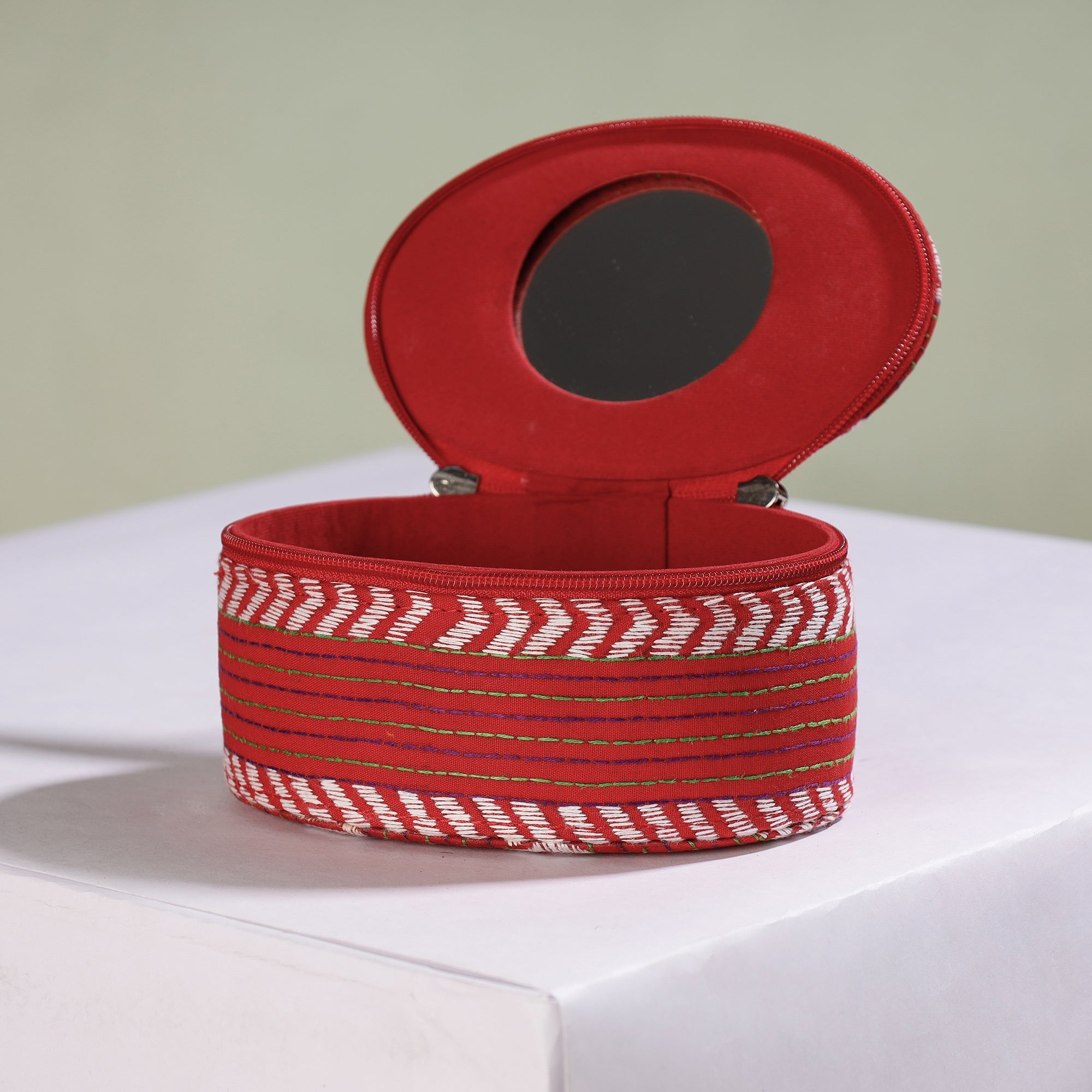 | Material | Fine quality red kantha work handcrafted jewelry storage box from West Bengal. Made from millboard, the box is lined with kantha work fabric outside & soft velvet with small mirror inside. It protect your beloved jewelry from scratch and dust. |