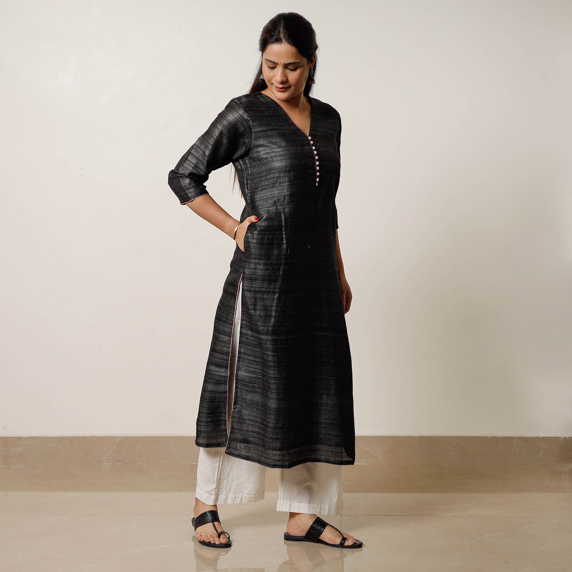 Look and feel beautiful in this uniquely designed pure desi tussar silk plain long Kurta with side pocket. This silk Kurta makes you comfortable with ease all day long. This Kurta is perfect for your daily outing and for a special occasion.