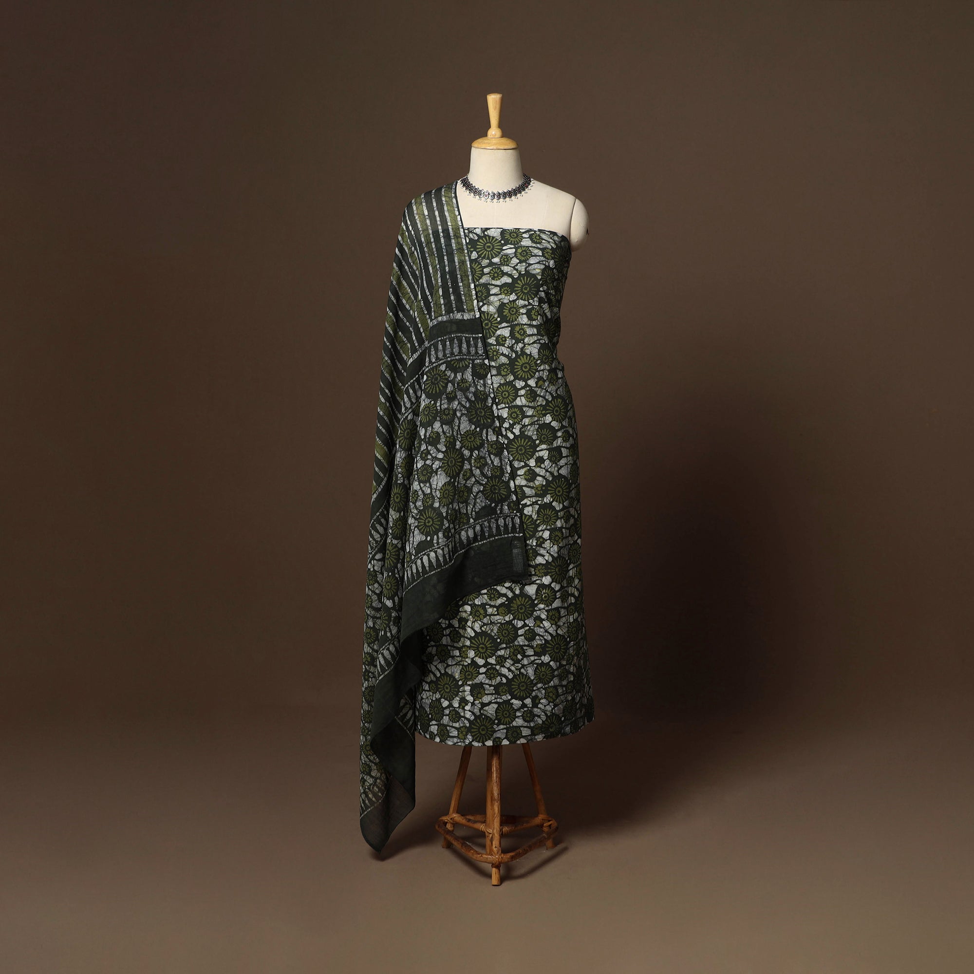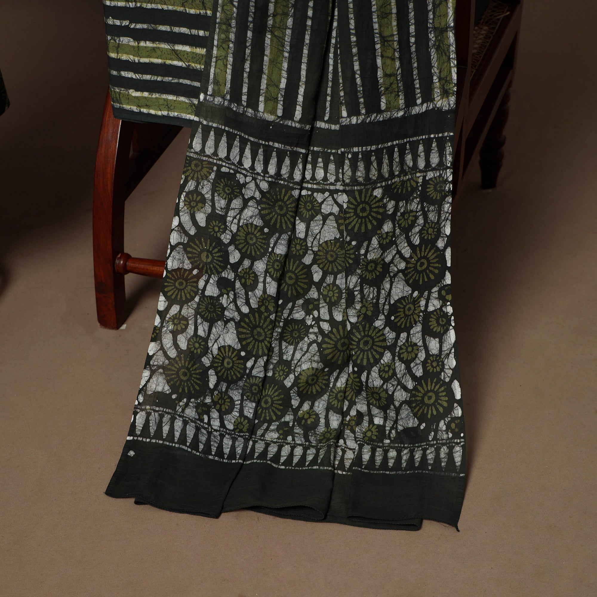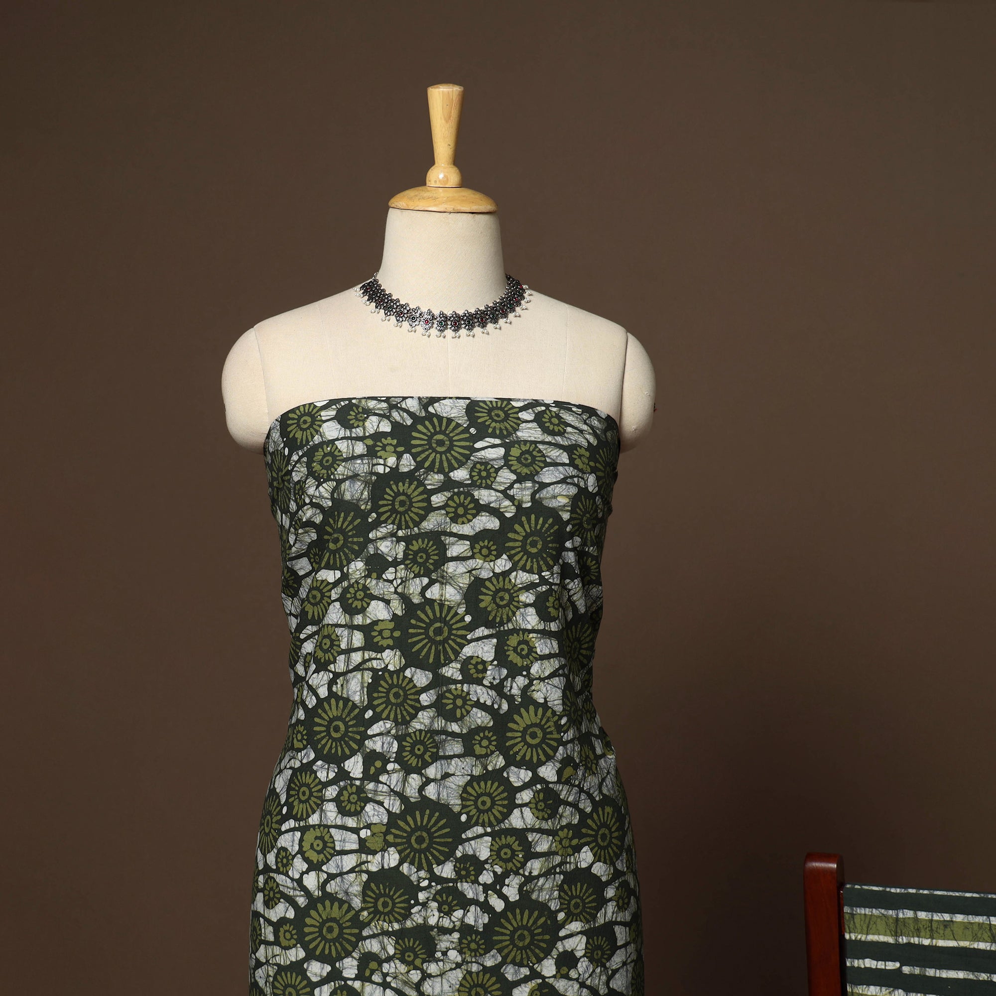 Experience the timeless charm of green kutch batik print cotton dress material. Featuring traditional wax resistant dyeing techniques this 3 piece set showcases intricate patterns that reflect Indias rich artisanal heritage. Perfect for creating stylish comfortable outfits the cotton fabric. Ideal for both casual and festive occasions this suit material brings a touch of elegance to your wardrobe.