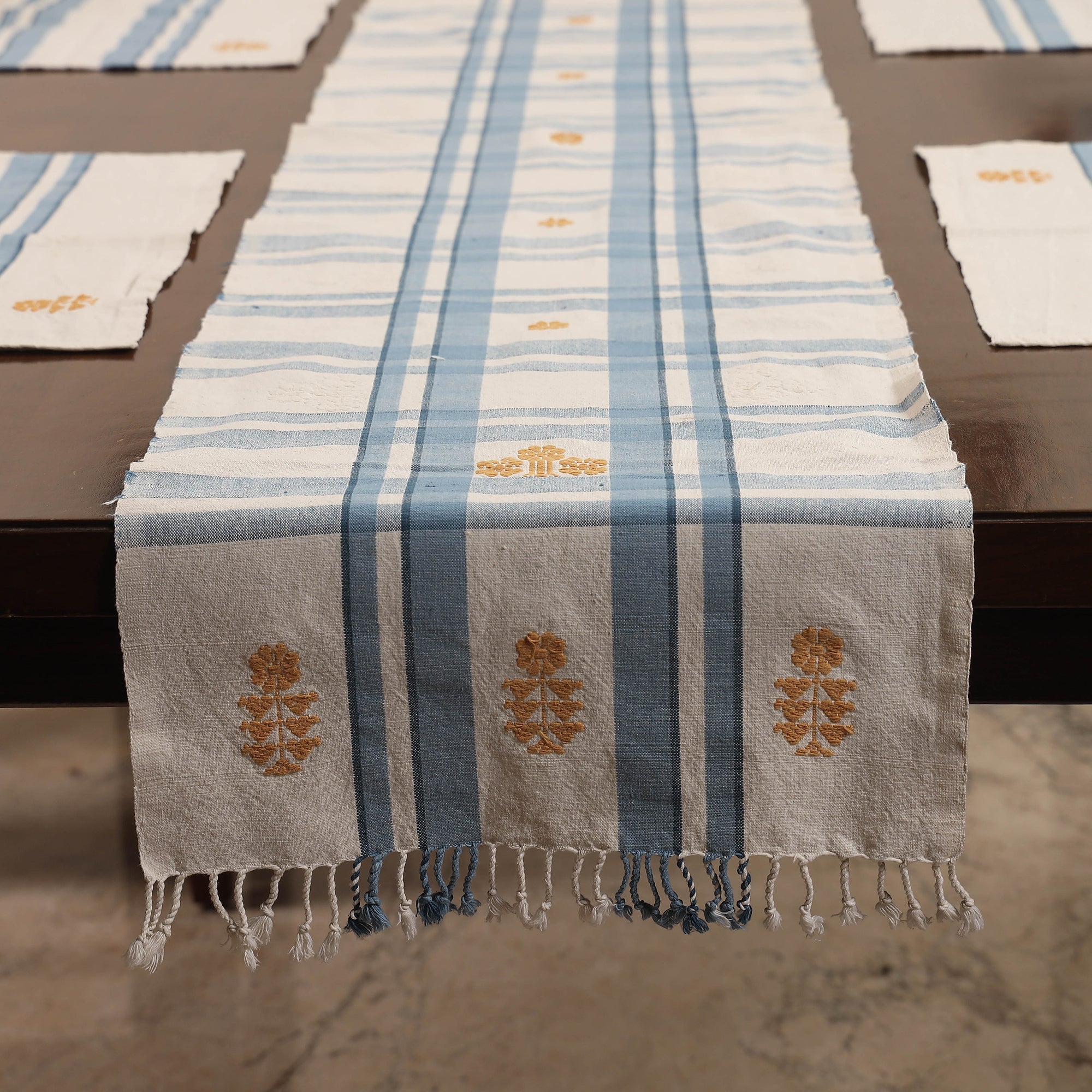 Fine quality, white pure handloom cotton dining table runner and placemat set from Assam. This table runner and placemats are made by skilled artisans in Assam using the technique of extra weft weaving. Azo-free dye has been used.