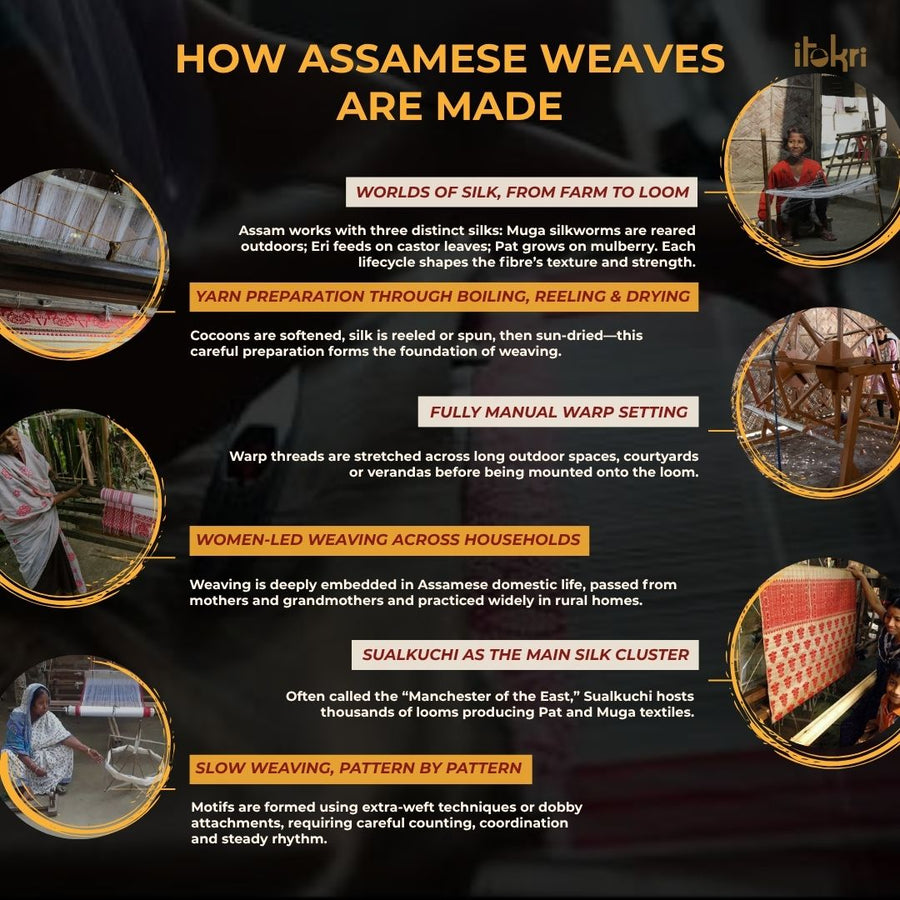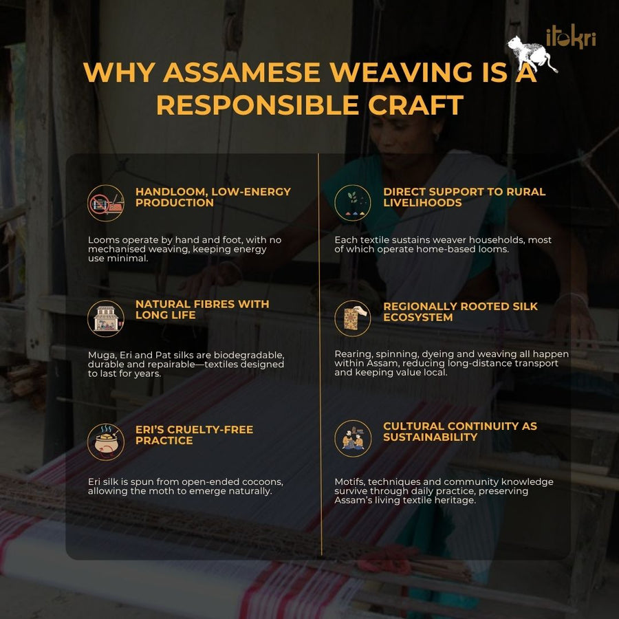 Assamese weave, dating back over 2,000 years, is a traditional handloom craft known for intricate motifs on silk and cotton. It is deeply tied to Assam’s culture, seen in textiles like the gamusa and mekhela chador.