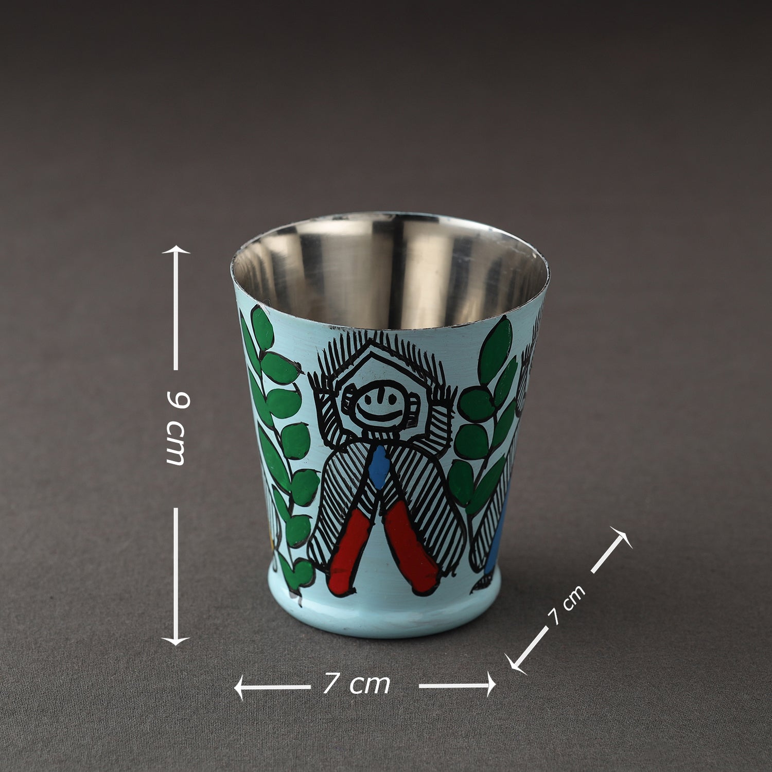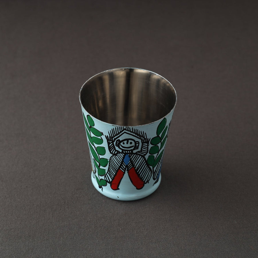 Blue godna madhubani handpainted glass with waterproof oil based paint on very high quality stainless steel by the artisans of Bihar. This glass is perfect for serving lemonade, water, juice etc. It is made from premium quality steel and is absolutely durable.