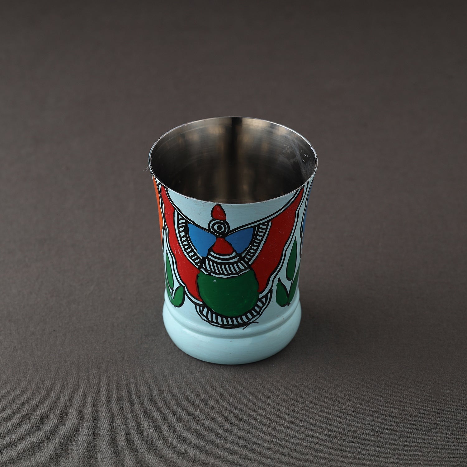 Blue godna madhubani handpainted glass with waterproof oil based paint on very high quality stainless steel by the artisans of Bihar. This glass is perfect for serving lemonade, water, juice etc. It is made from premium quality steel and is absolutely durable.