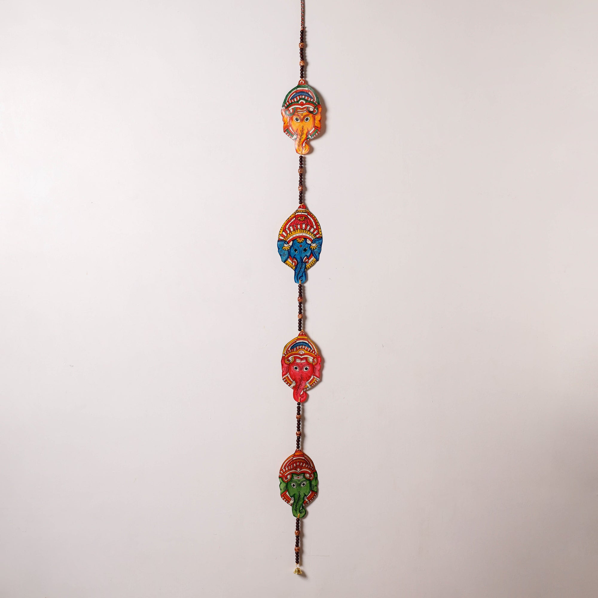 | Material | Fine handmade Tholu Bommalata leather puppet wall hanging with wooden beads. Tholu Bommalata is the shadow puppet theatre tradition of the state of Andhra Pradesh in India. Tholu bommalata literally means "the dance of leather puppets" (tholu – "leather" and bommalata – "puppet dance") is a 2000 year old craft and is one of the oldest form of performing arts.. The traditional process of crafting shadow puppets requires 30-40 days, from the procurement of leather to the completion of the product. Two other kinds of shadow puppetry are practiced in Andhra Pradesh, the Sutram Bommalata (String puppets) and the Koyya Bommalata(Wooden puppets). The leather puppets, because of their transparency and jewel like glow, are most popular. The puppets are mounted in the middle on a palm stem, extended to form a handle used to move the body of the puppet. The puppets are painted with hands using natural and poster colours. But apart from the translucency and vivid colours, what gives these puppets their brilliance, is the perforated designs drawn on the characters to depict jewellery. Once surrounded by colour and viewed against the light, they look like glowing jewels. |