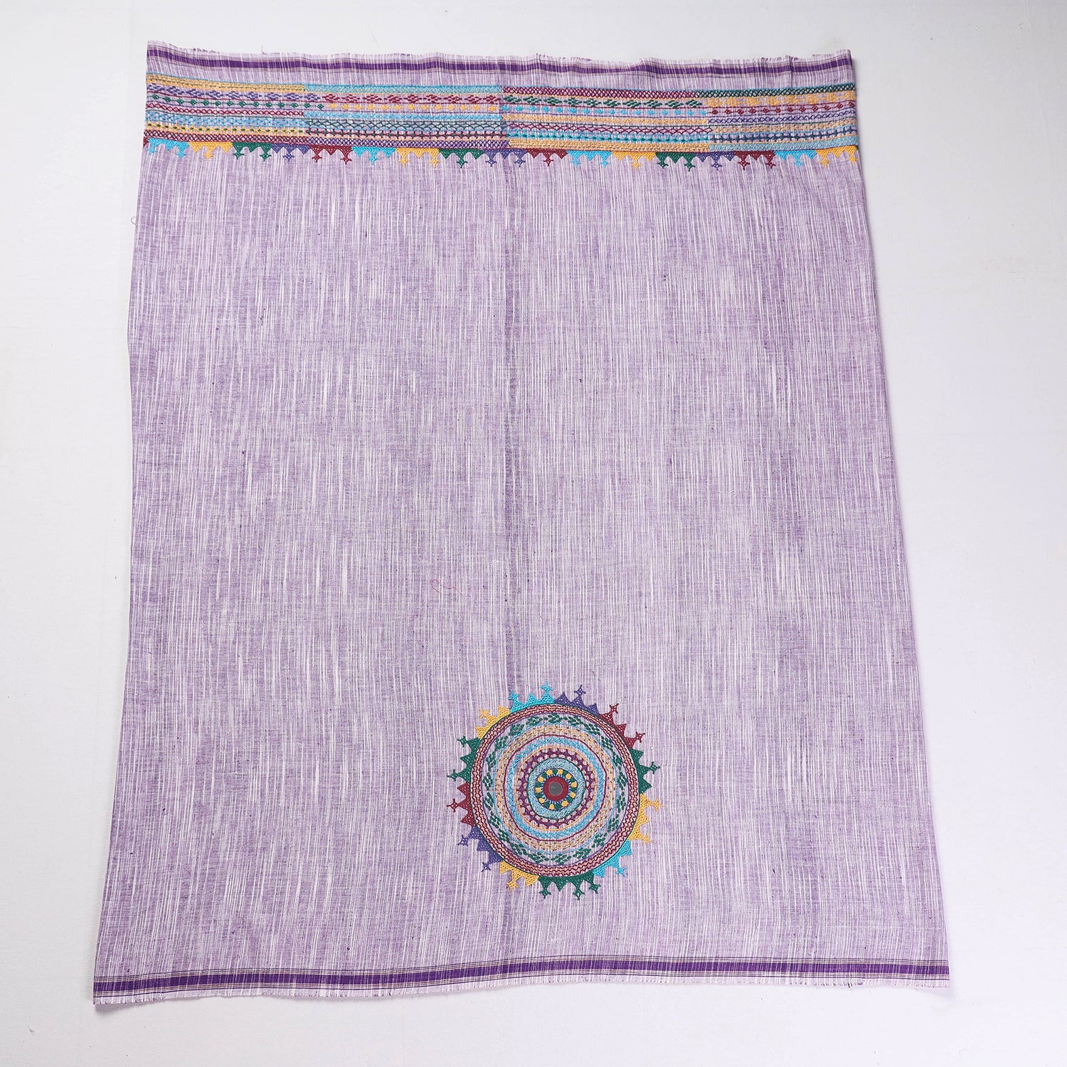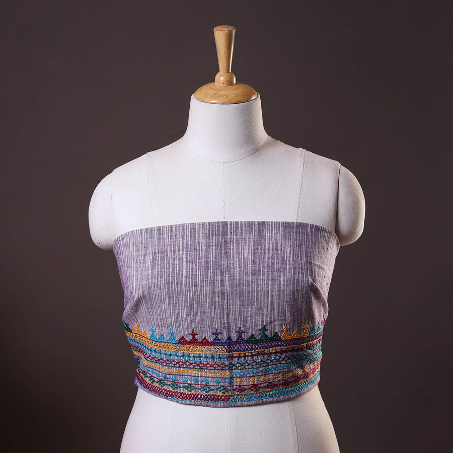 This purple handspun fine cotton blouse piece features intricate Lambani embroidery, known for its bold patterns and detailed needlework. The textured fabric offers a soft, breathable feel, making it ideal for everyday or festive wear. Pair it with your favourite sarees to add a touch of vibrant tradition and artisanal elegance to your outfit.