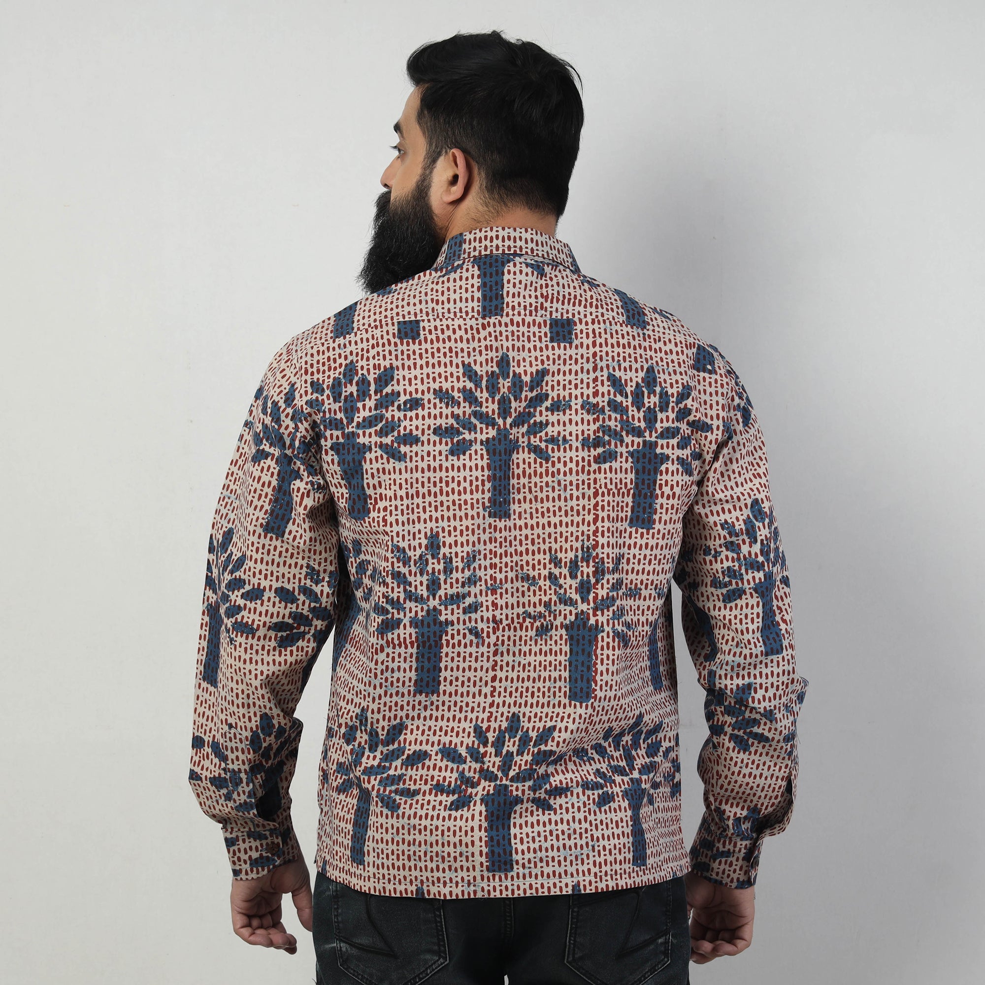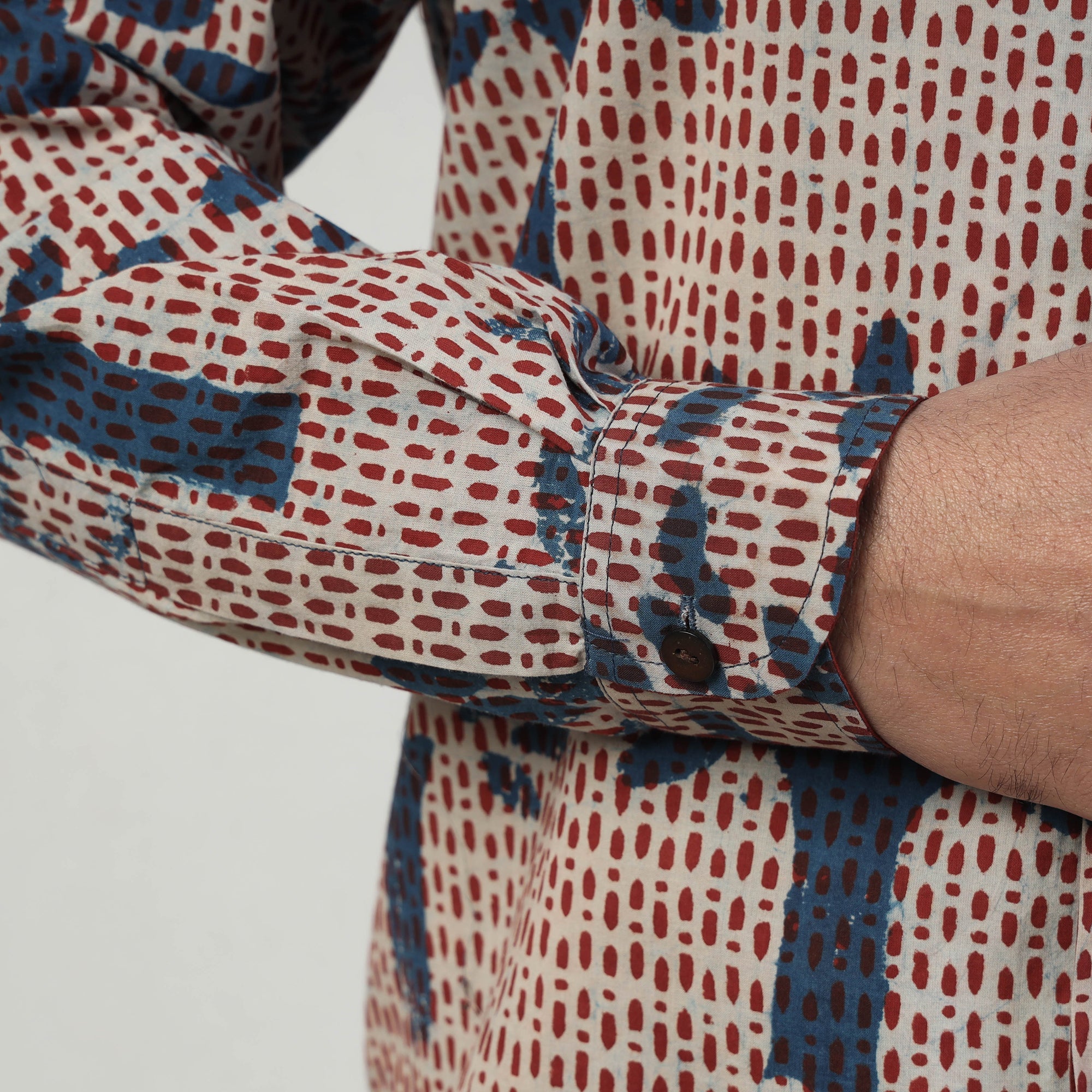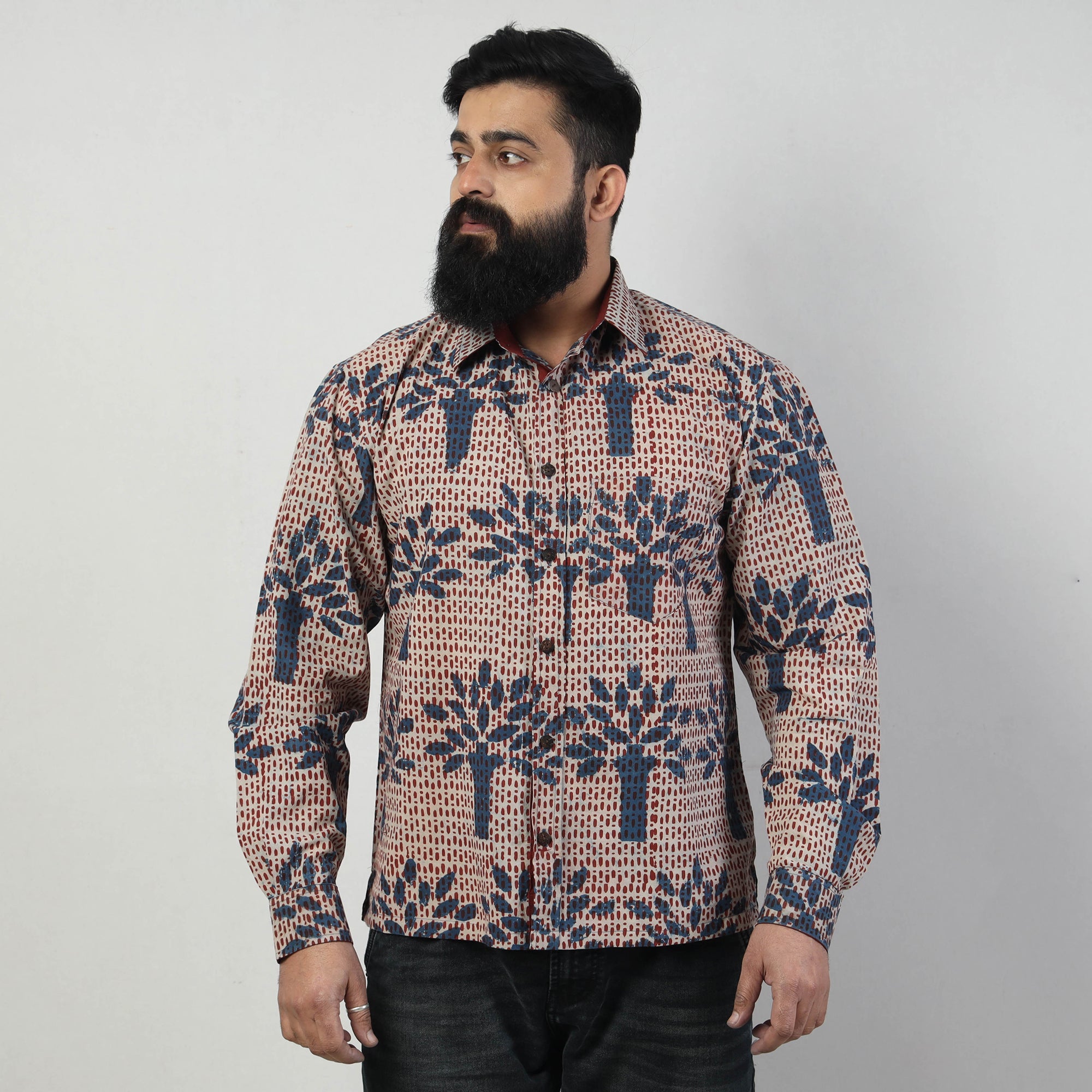 Special Bindaas Unlimited! hand art block printed, pure cotton, naturally dyed shirt for men. This shirt comes with a regular collar and full sleeves. Contemporary designs are made through traditional processes by skilled fourth-generation textile printers in Rajasthan. This slow-fashion, hand block printed cotton shirt reintroduces traditional skills while maintaining a modern aesthetic and design. To make these shirts, it takes: a 100-year-old technique; 15–22 processes; 25–40 pairs of hands; 65 hours spread over at least 12 days; and a lot of sun and sand!