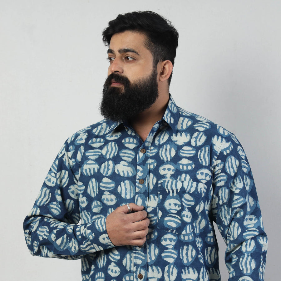 Special Bindaas Unlimited! hand art block printed, pure cotton, naturally dyed shirt for men. This shirt comes with a regular collar and full sleeves. Contemporary designs are made through traditional processes by skilled fourth-generation textile printers in Rajasthan. This slow-fashion, hand block printed cotton shirt reintroduces traditional skills while maintaining a modern aesthetic and design. To make these shirts, it takes: a 100-year-old technique; 15–22 processes; 25–40 pairs of hands; 65 hours spread over at least 12 days; and a lot of sun and sand!