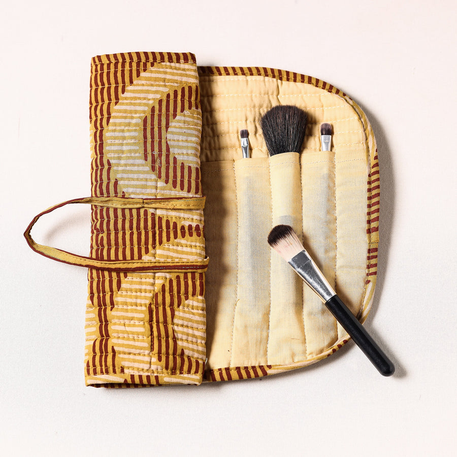 Handcrafted multipurpose segmented Make-up Brush Wrap Pouch / storage organizer made from cotton fabrics & foam, textured with handmade textiles of India. It has one big & five small pockets.