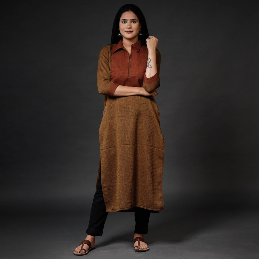 Look and feel beautiful in this uniquely designed kumaun handwoven straight merino woolen kurta with a side pocket. This woollen kurta will keep you comfortable all day long this winter season, and the natural fibres and hand-spun soft texture ensure that this kurta will give a soft and soothing touch against your skin.