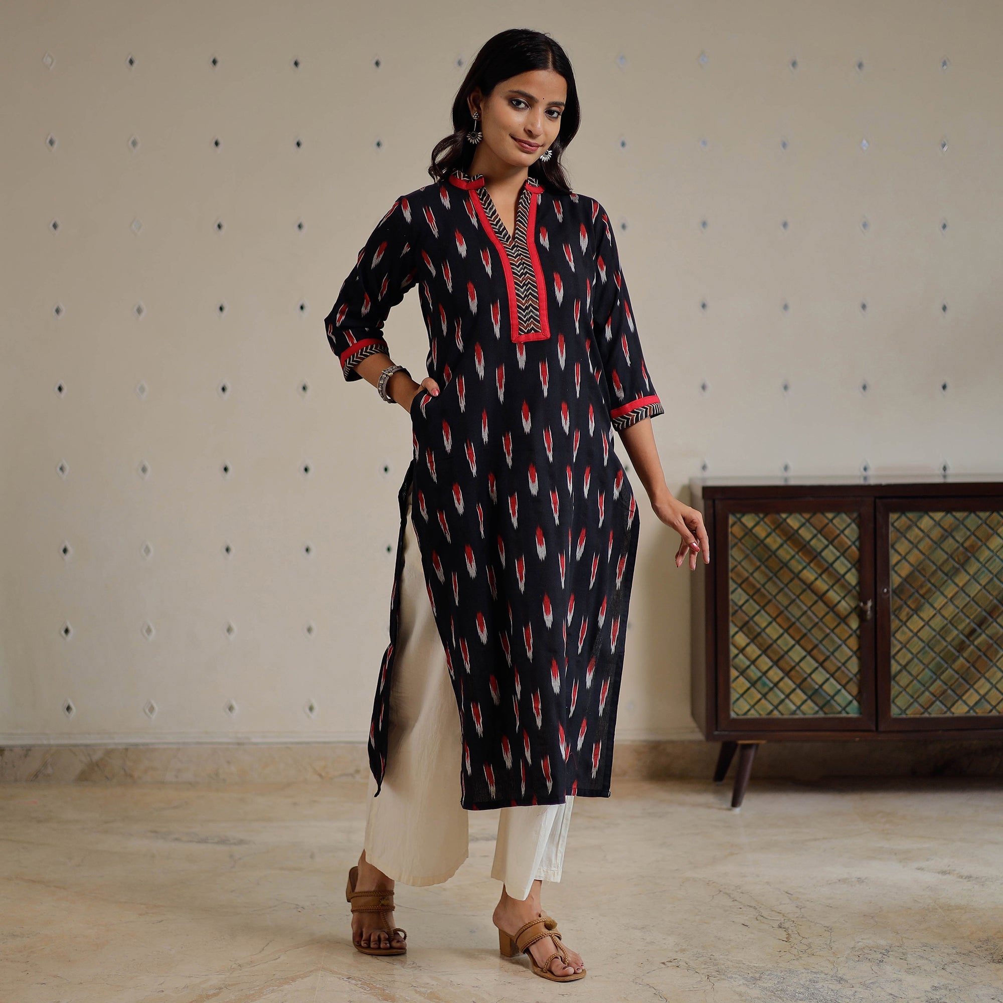 Look and feel beautiful in this uniquely designed pochampally ikat weave cotton long kurta with side pocket. This cotton kurta makes you comfortable with ease all day long. Ikat has lovely patterns in extremely beautiful colours. Ikat fabrics are world famous for their colours, texture and designs. Indian Ikat is one of the fabrics that is always admired by the fashion designers around the world.