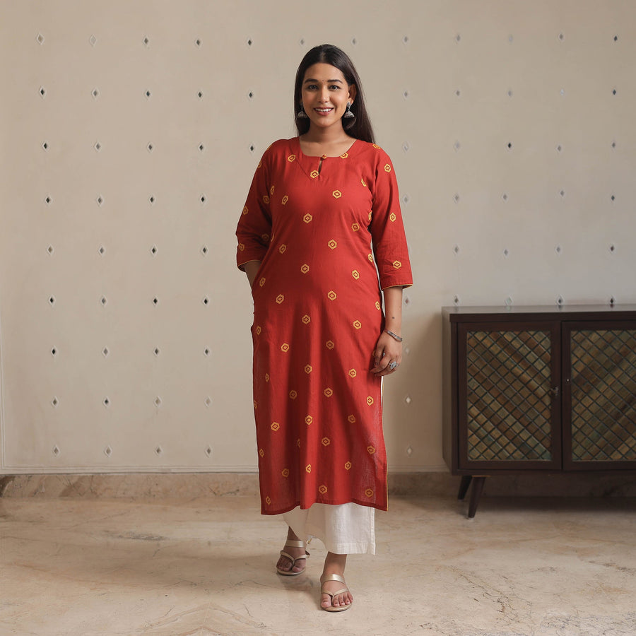 Look and feel beautiful in this uniquely designed jacquard cotton straight kurta with side pocket. This cotton kurta makes you comfortable with ease all day long.