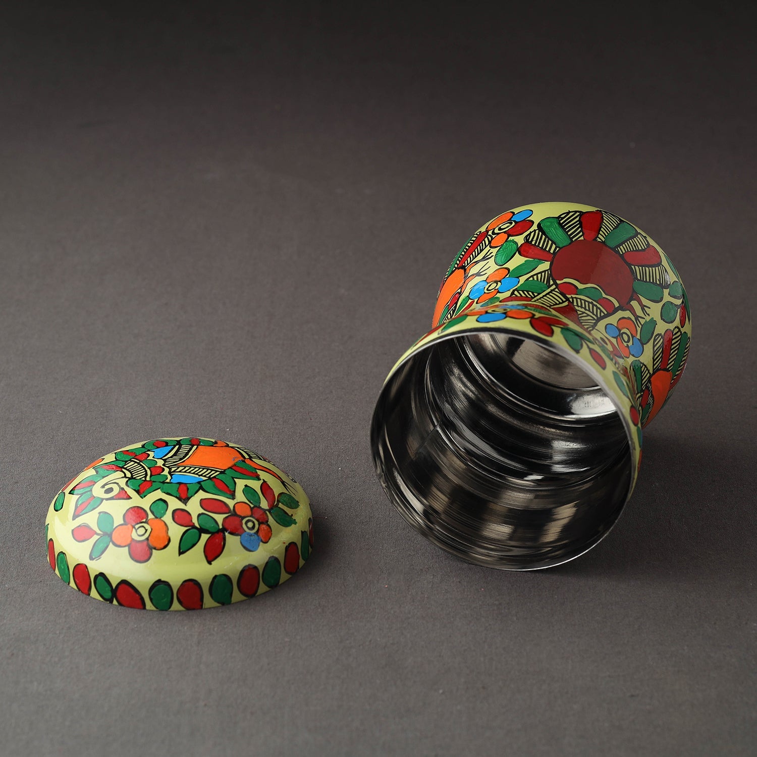Green godna madhubani handpainted multi utility canister with waterproof oil based paint on very high quality stainless steel by the artisans of Bihar.