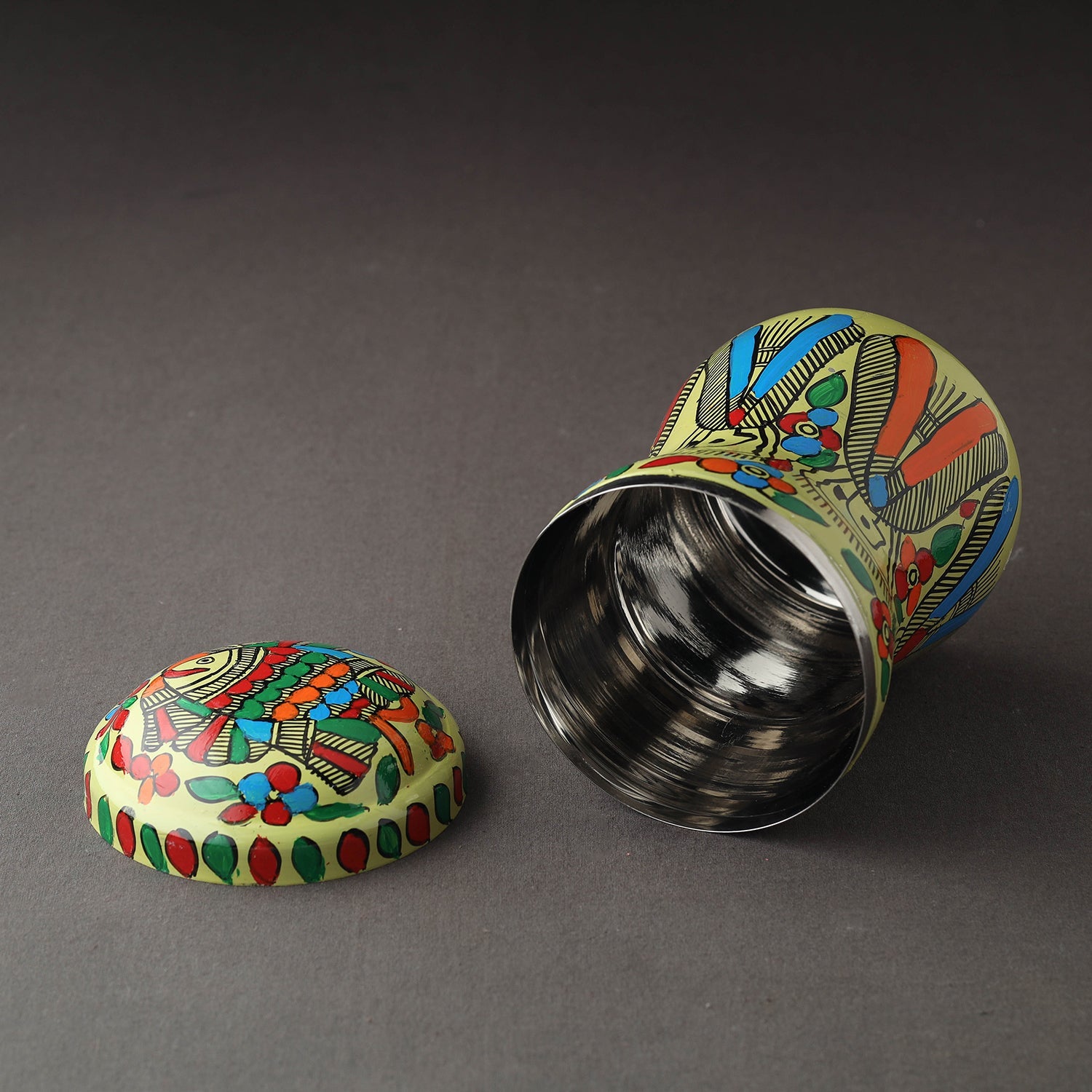 Green godna madhubani handpainted multi utility canister with waterproof oil based paint on very high quality stainless steel by the artisans of Bihar.