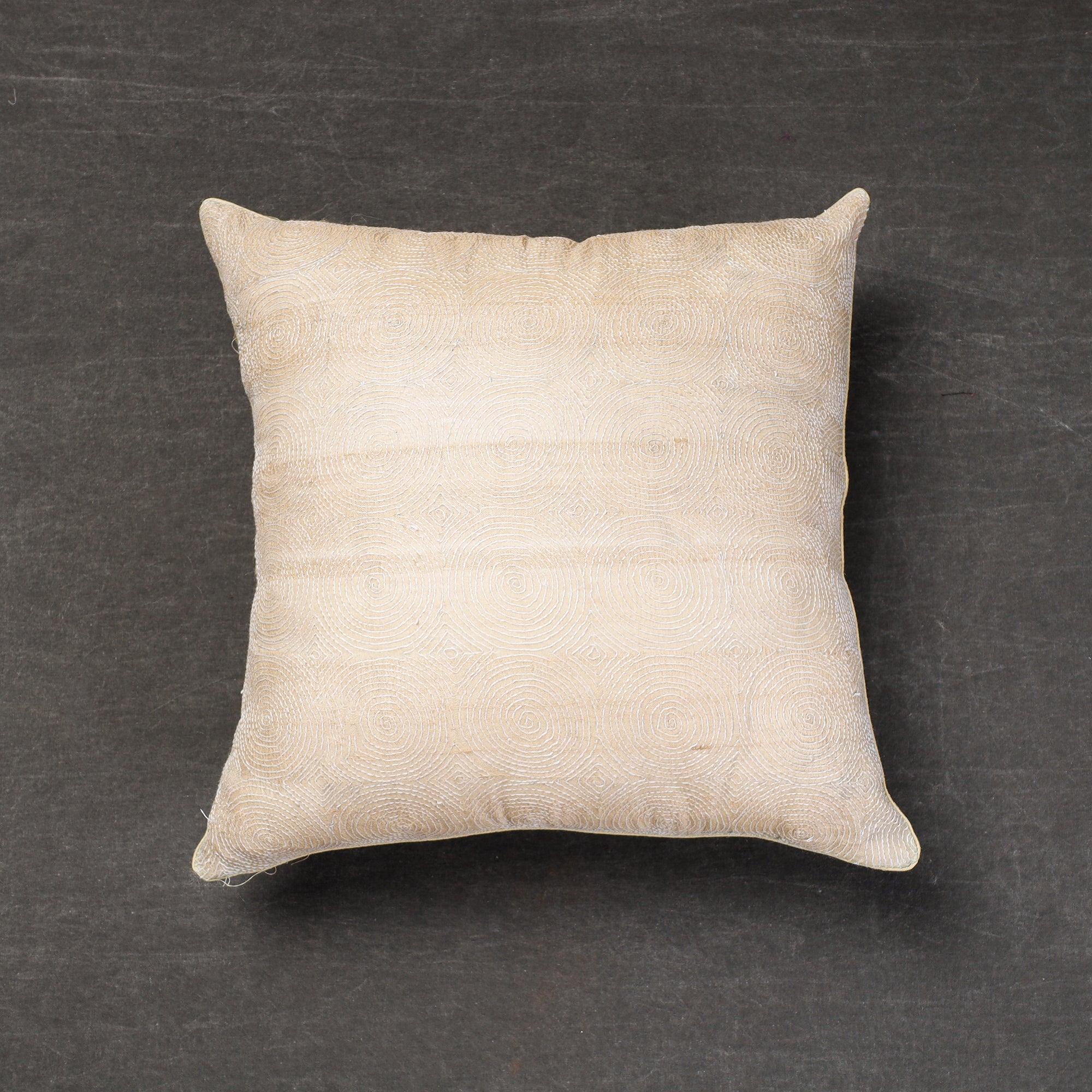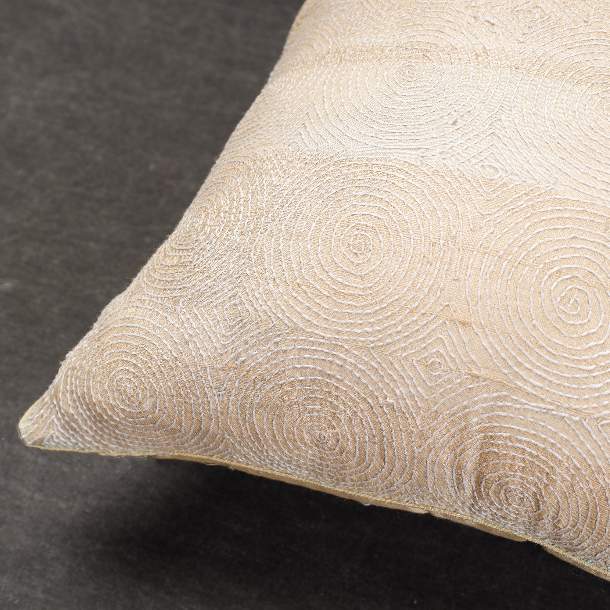 Fine quality kantha hand-embroidery tussar silk cushion cover, designed with contemporary patterns & has been hand embroidered using West Bengal's traditional craft technique of kantha. (It has silk fabric on the backside.)