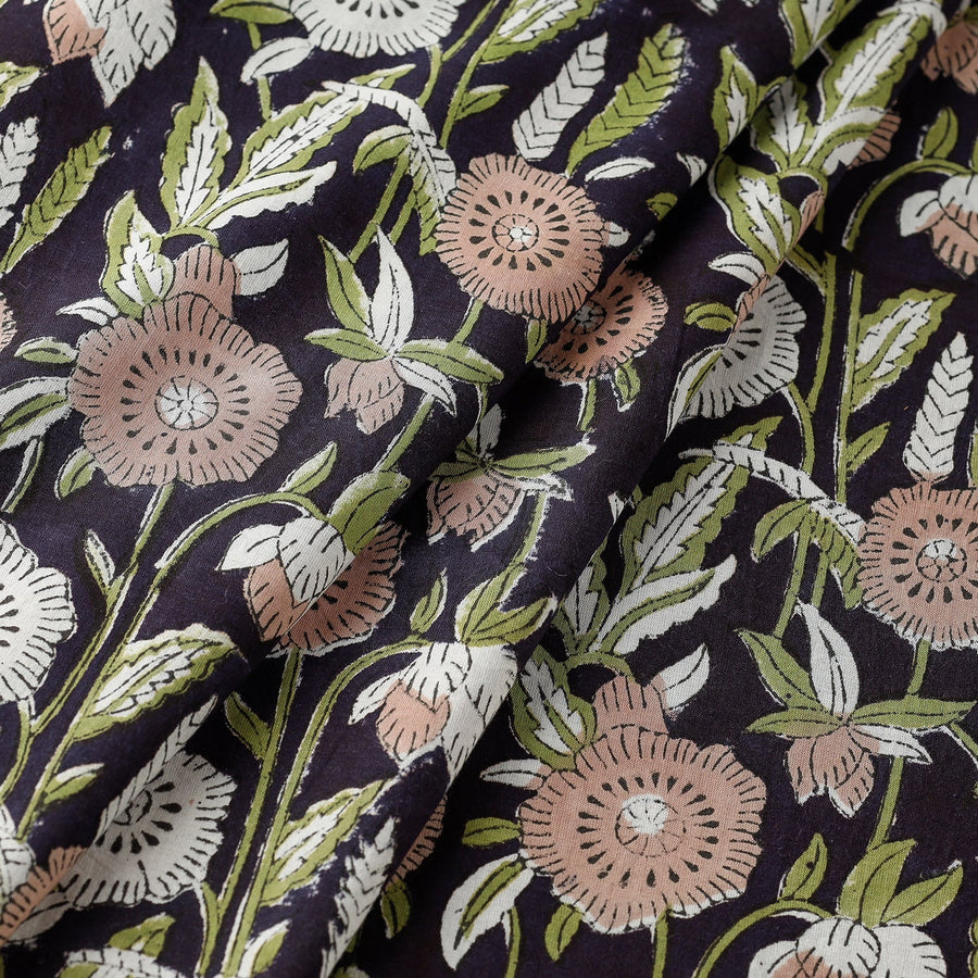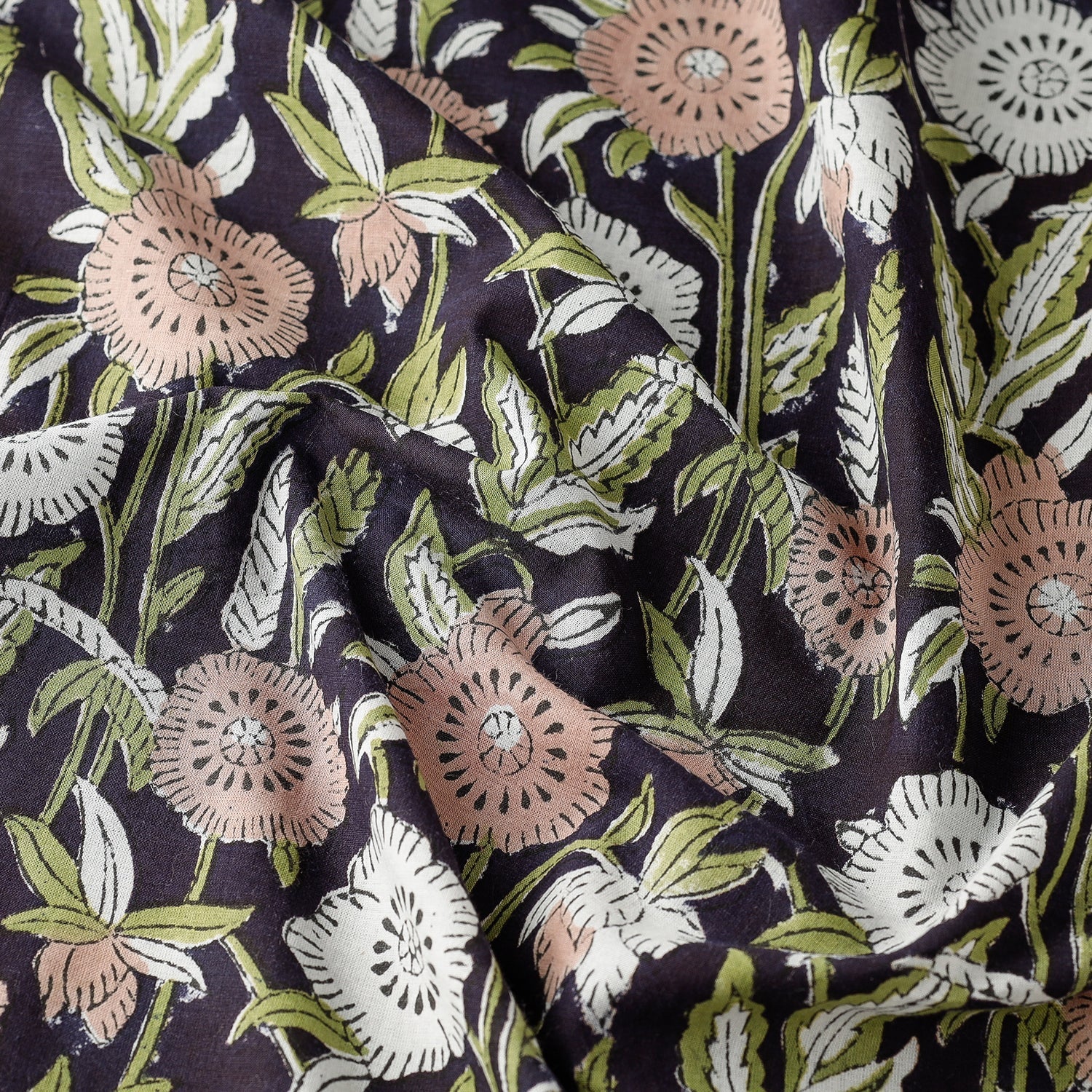 Fine quality black floral sanganeri hand block printed cotton fabric. Sanganeri is a hand-block printing technique originating from Sanganer, a village in the southern part of Jaipur, Rajasthan. Bleed free VAT dyes used.
