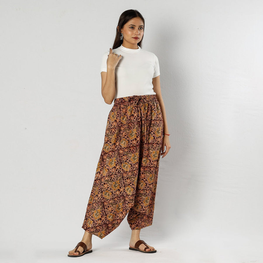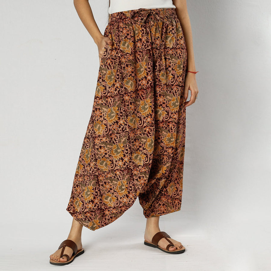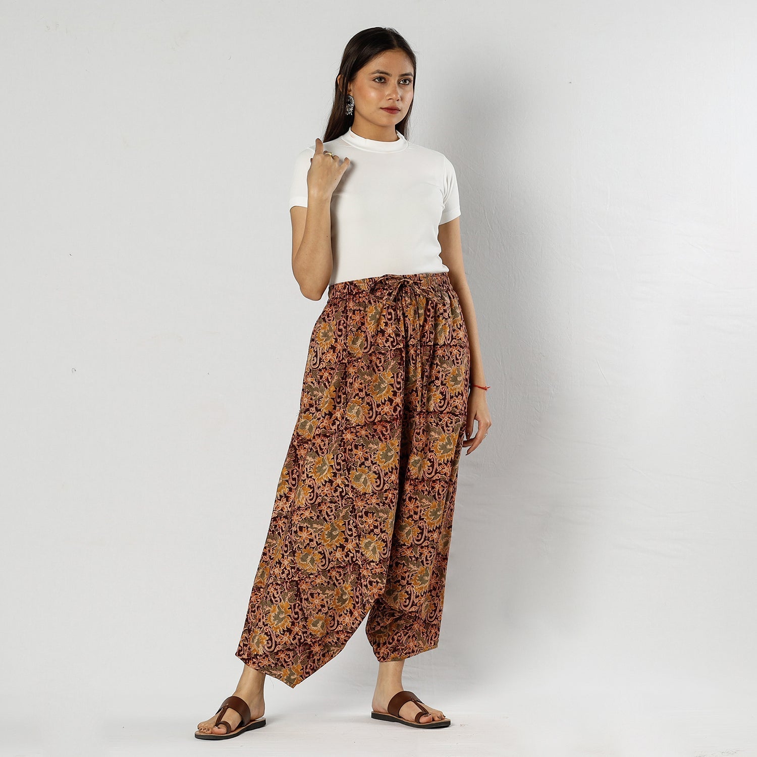 Feel and look beautiful in this pedana kalamkari block print cotton elasticated casual harem pant with side pockets. This cotton harem pant makes you feel comfortable and stylish all day long. This harem pant is perfect for your daily outings.