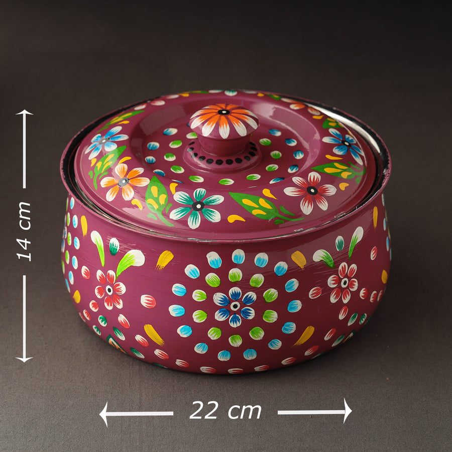 Purple handpainted casserole with waterproof oil based paint on very high quality stainless steel by the artisans of Banaras.