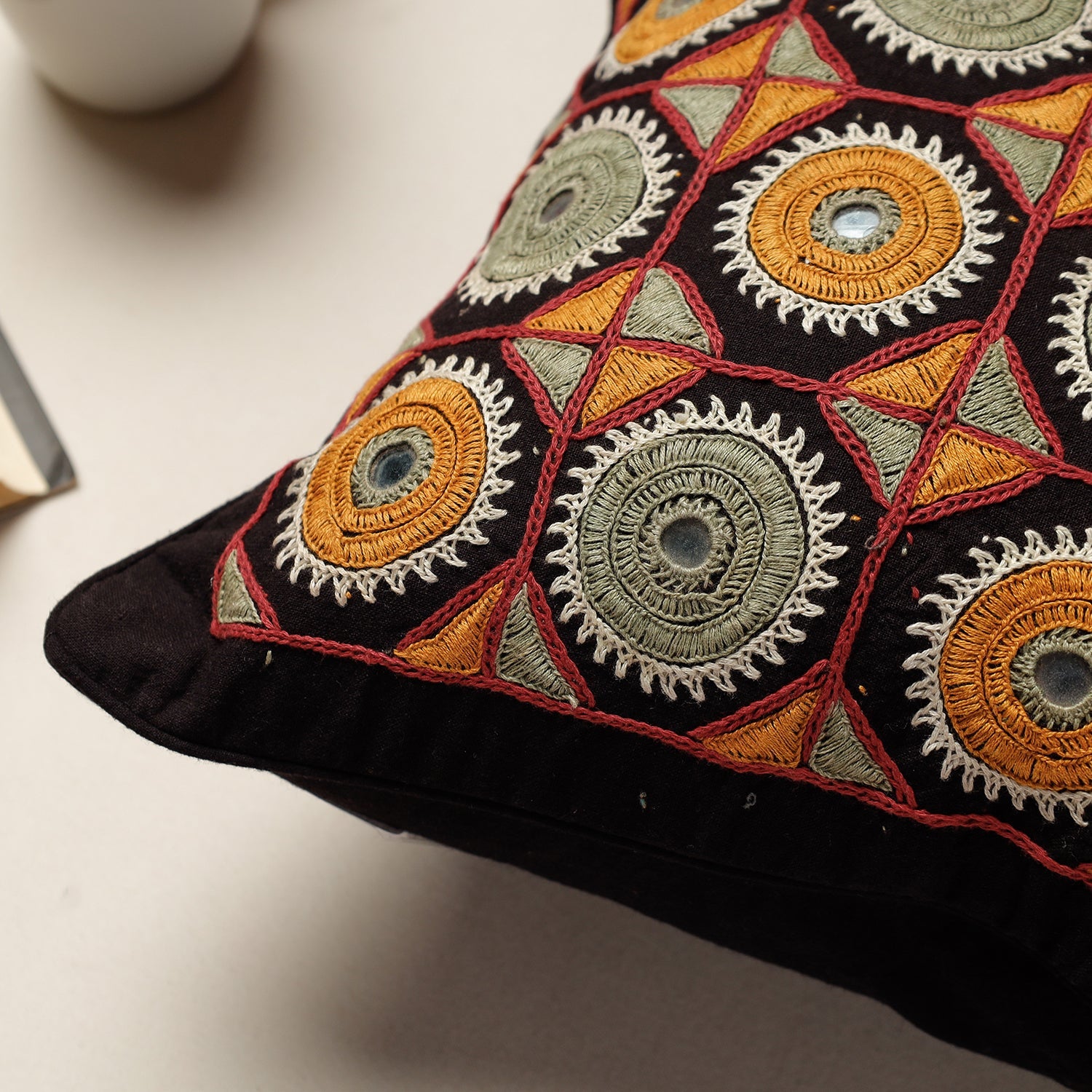 Fine quality Rabari hand embroidery cotton cushion cover. This cushion cover is made from cotton fabric with beautiful Rabari embroidery by artisans of Kala Raksha. Rabari embroidery is unique to the nomadic Rabaris. Essential to Rabari embroidery is the use of mirrors in a variety of shapes. Rabaris outline patterns in chain stitch, then decorate them with a regular sequence of mirrors and accent stitches, in a regular sequence of colors. Rabaris also use decorative back stitching, called bakhiya.