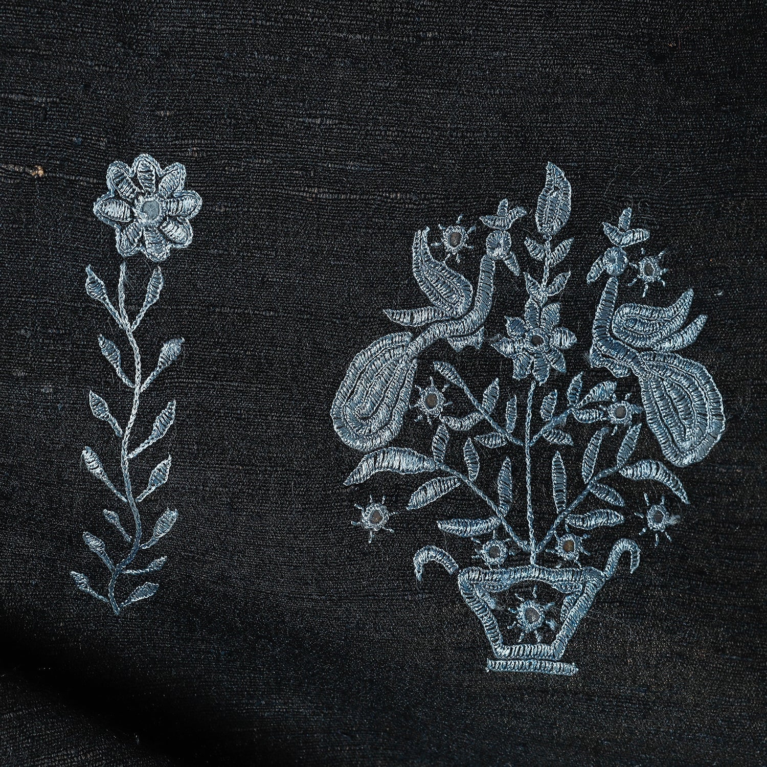 Kutch work embroidery is done with silk or woolen thread using fine stitches to create detailed and elaborate patterns. Motifs and designs draw inspiration from romantic, architectural, and human motifs, as well as Persian and Mughal art.