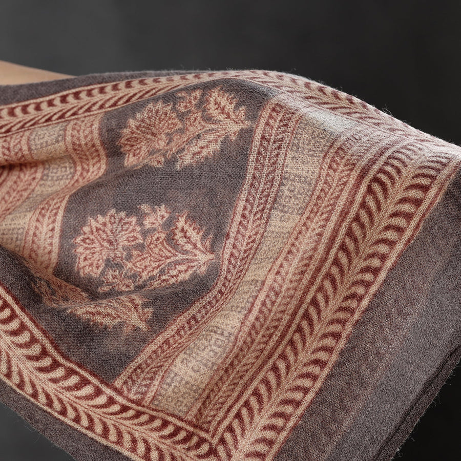 Fine quality beige bagh block printing pure woolen muffler. This muffler is made using natural dyes through the traditional process of hand block printing by Bilal Khatri in Bagh, the Dhar district of Madhya Pradesh.