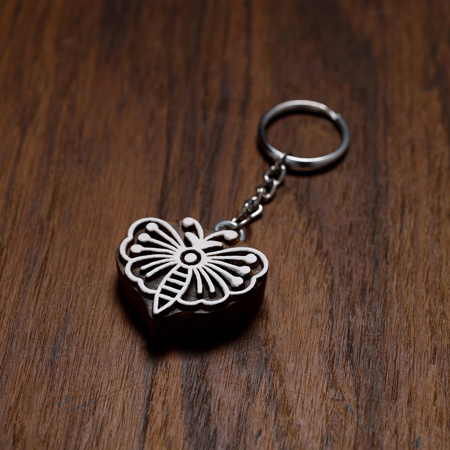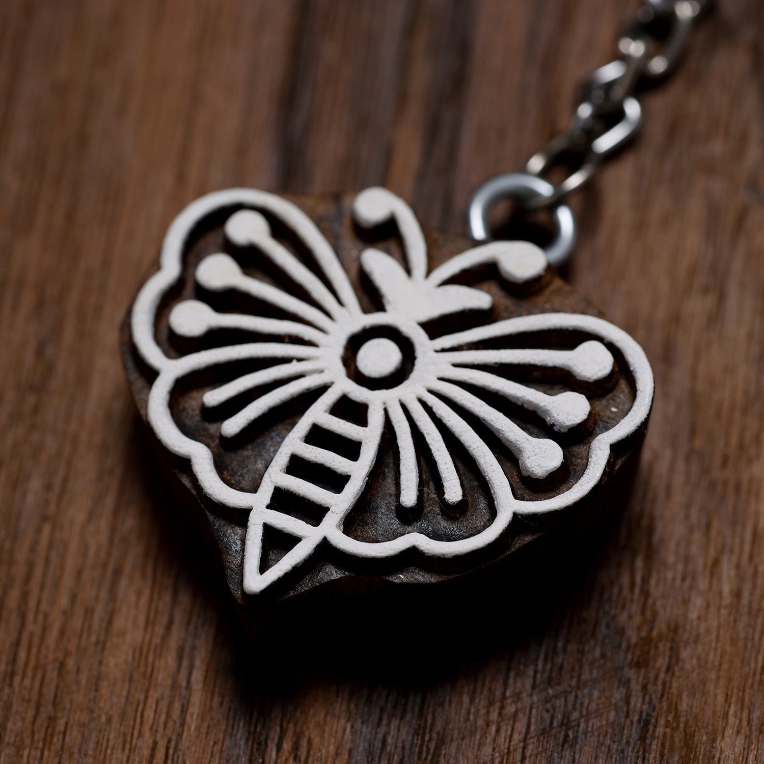 Intricately brown hand-carved natural sheesham wood block keychain. Motifs are carefully engraved onto flat and smooth blocks of wood by skilful hands. This keychain can also be used for block printing on fabric, paper, canvas, etc.