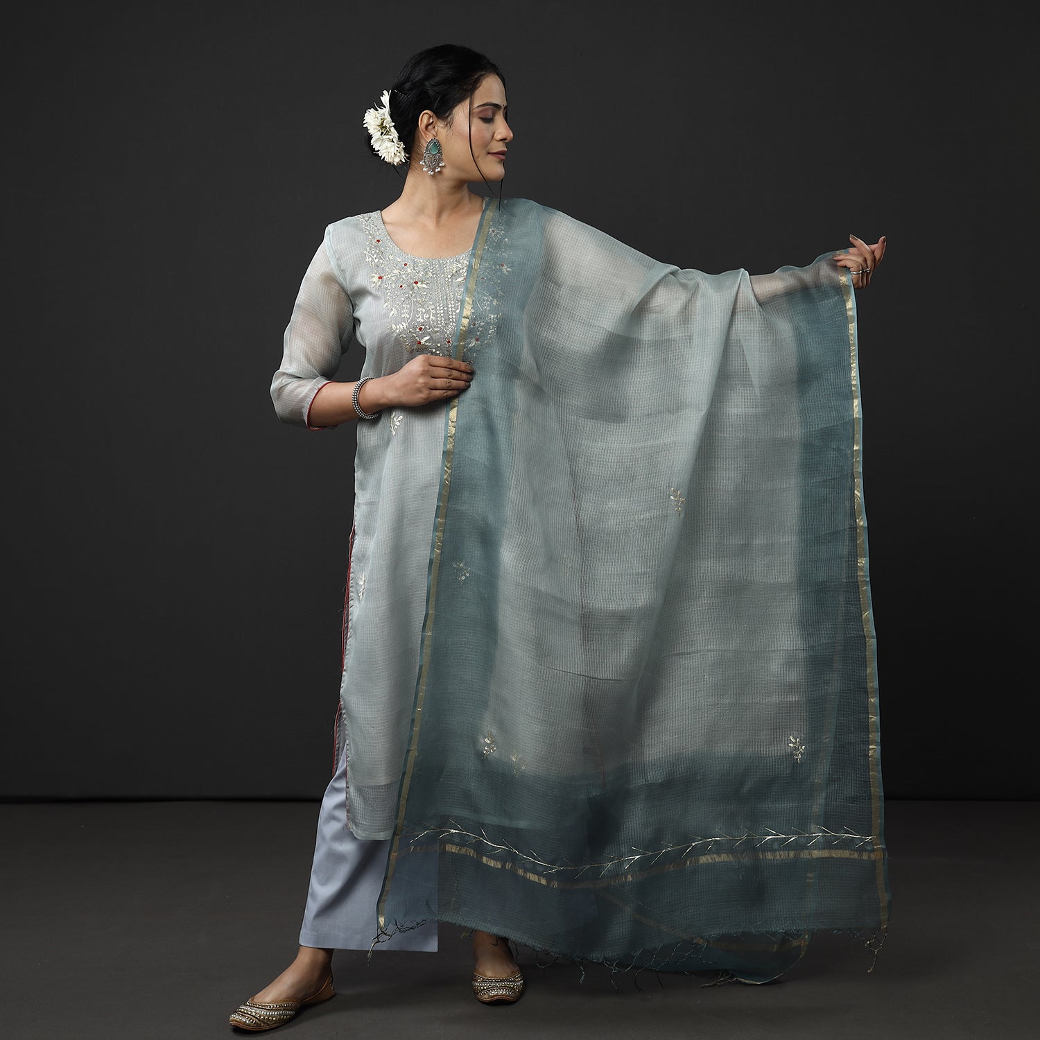 | Material | Look and feel beautiful in this uniquely designed kota doria pita work silk side pocket long kurta with dupatta & cotton palazzo set. Kota doria is an age-old Indian textile produced in the Kota district of Rajasthan. The Doria or the threads are finely interweaves to make the check patterns. Its lightweight and sheer texture give it an exquisite grace and elegance all its own. This suit is perfect for your special occasion. |