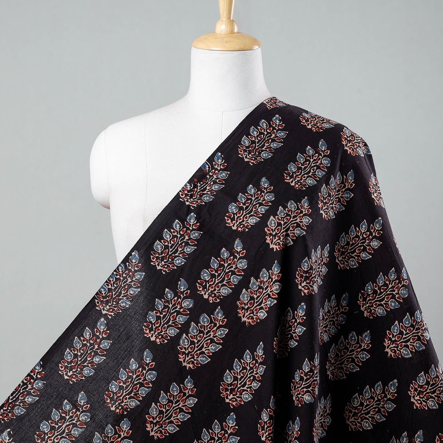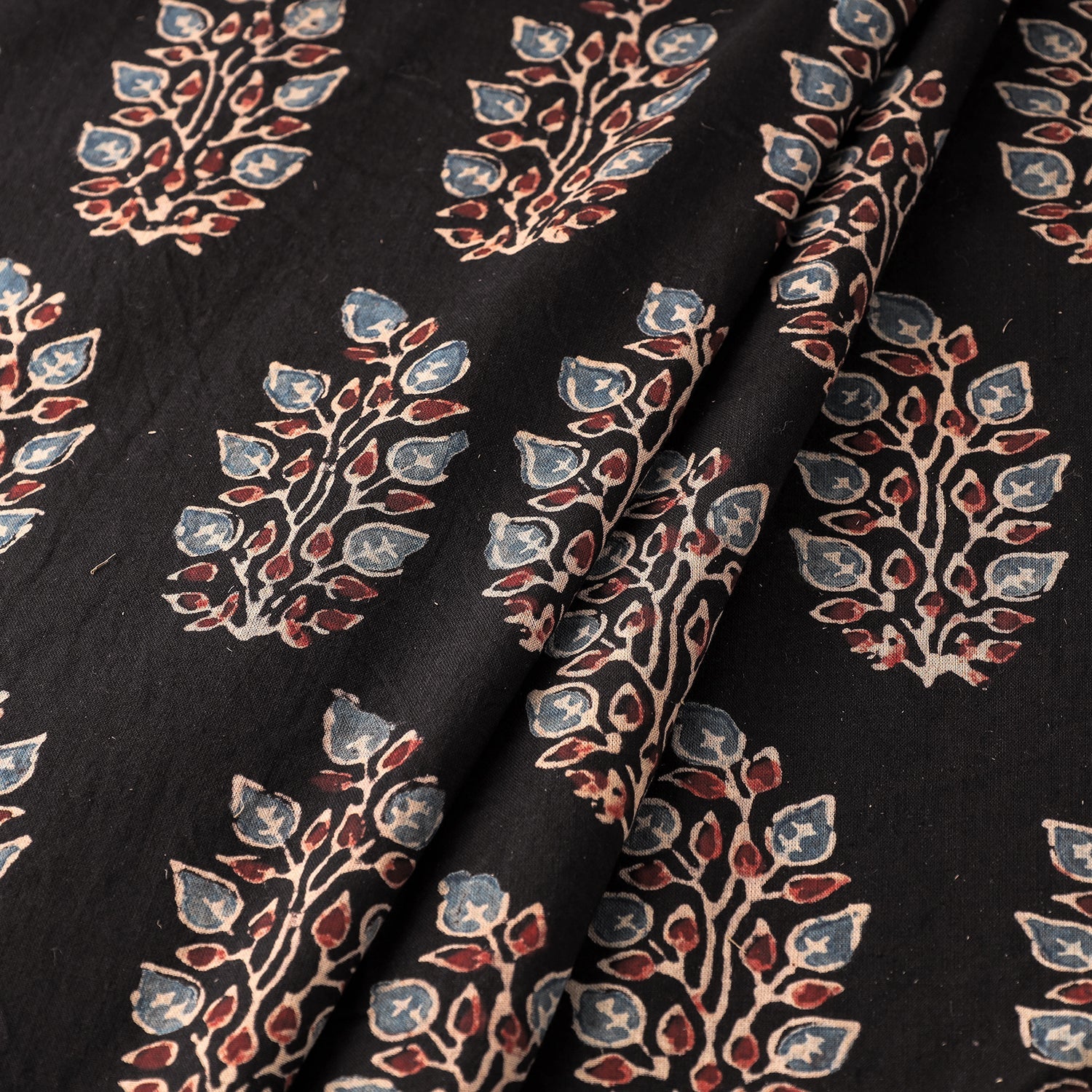 Black ajrakh fabric crafted using natural-dyeing and resist block-printing techniques. This ancient craft is estimated to be around 4,500 years old. The Ajrakh artisans in India originally migrated from Sindh to the Kutch region of Gujarat and to Barmer in Rajasthan. Ajrakh is also the traditional attire of the Maldhari pastoral community of Bhuj. The process is long and detailed, involving multiple stages where each layer of colour is printed only after a resting period, allowing the cloth to absorb the dye fully. Made of breathable cotton, it is ideal for creating kurtas, shirts, dresses, or even home decor items.