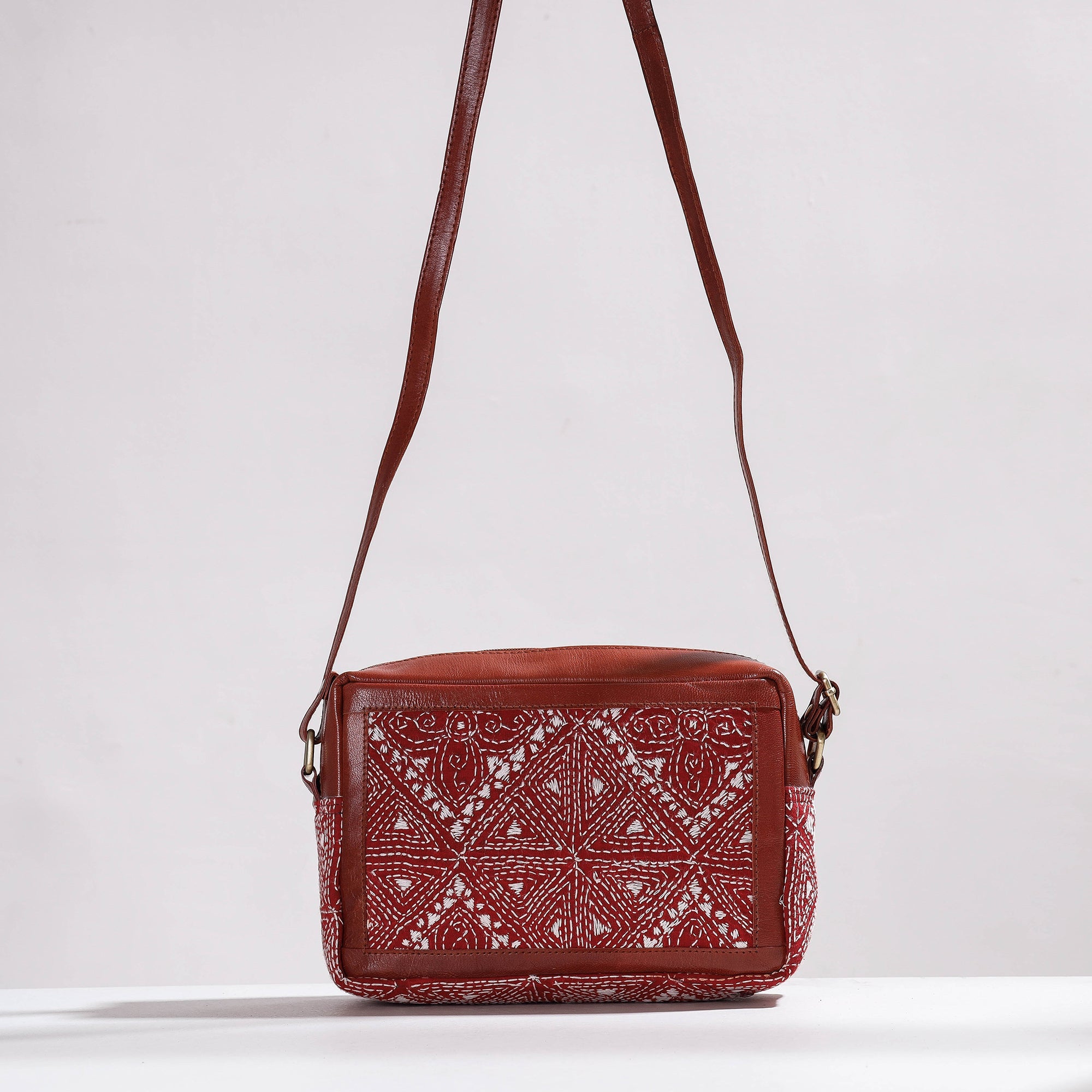 Red handcrafted leather sling bag with adjustable sling made by the master artisans of Kolkata, West Bengal. It has one simple pocket inside with cotton lining inside.