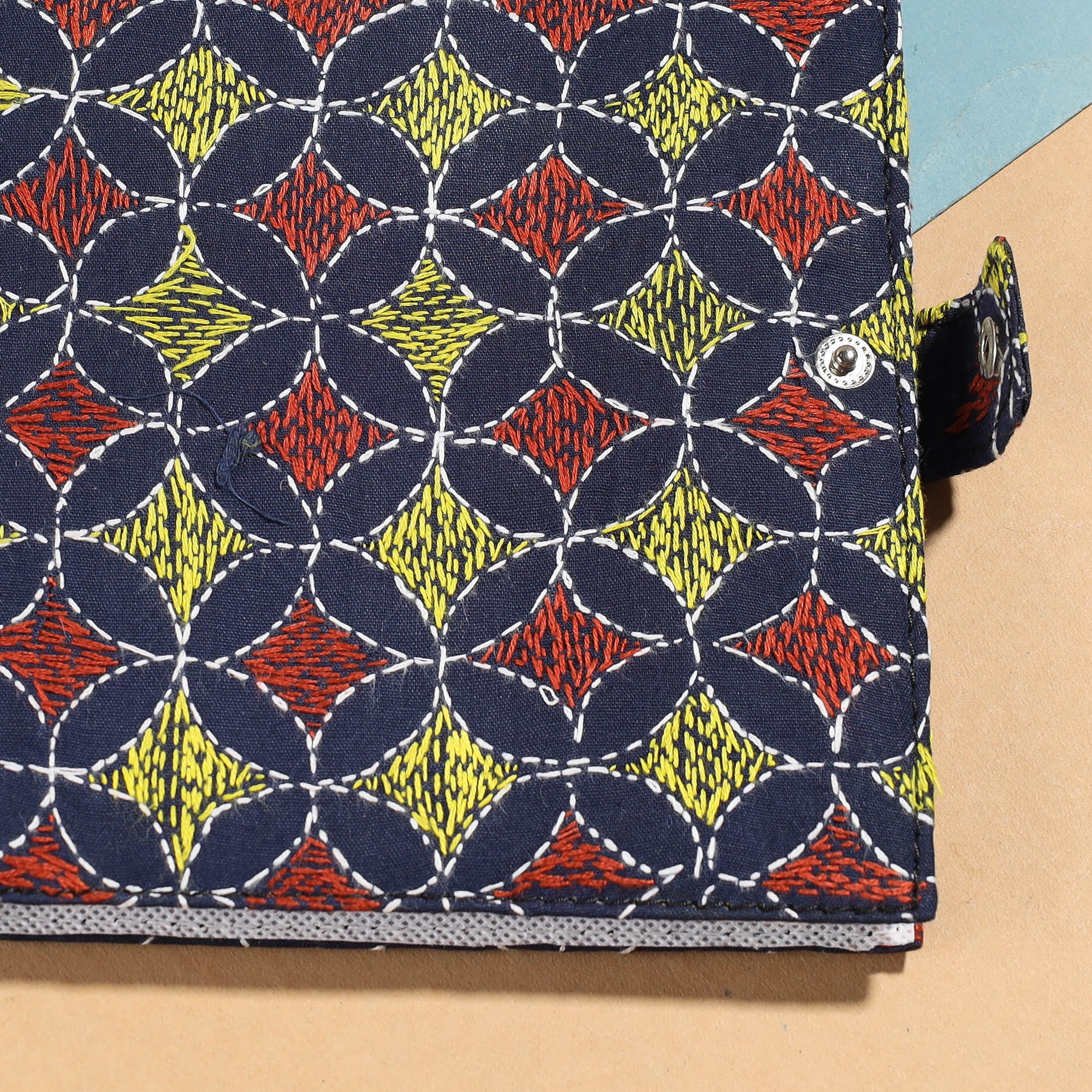Fine quality handcrafted Kantha work notepad from West Bengal. This notepad has a soft bound cover and hand embroidery done in the traditional Kantha style with colourful threads.