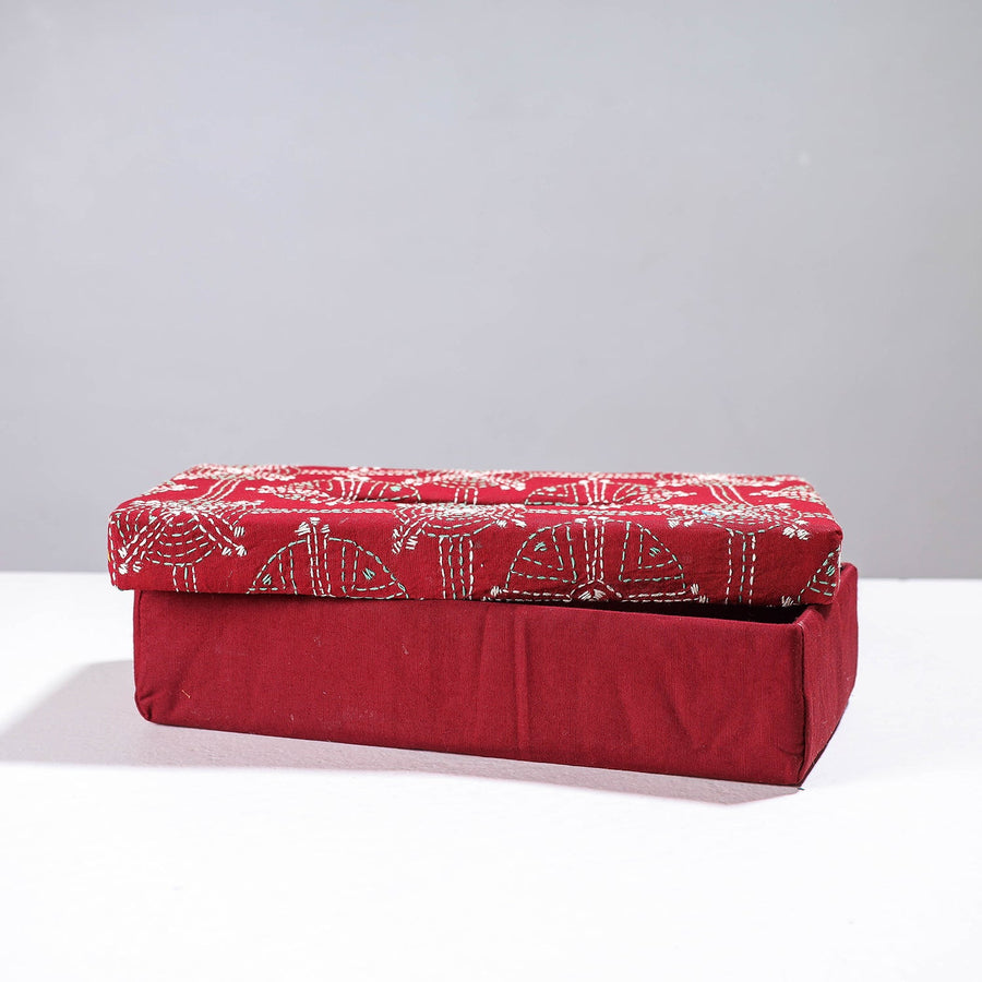 Fine quality, red handcrafted kantha-work tissue box from West Bengal. Made from hardboard, the box is lined with kantha work fabric. This tissue box is a beautiful and decorative box especially made for keeping tissues and paper napkins. Long lasting & sturdy material.