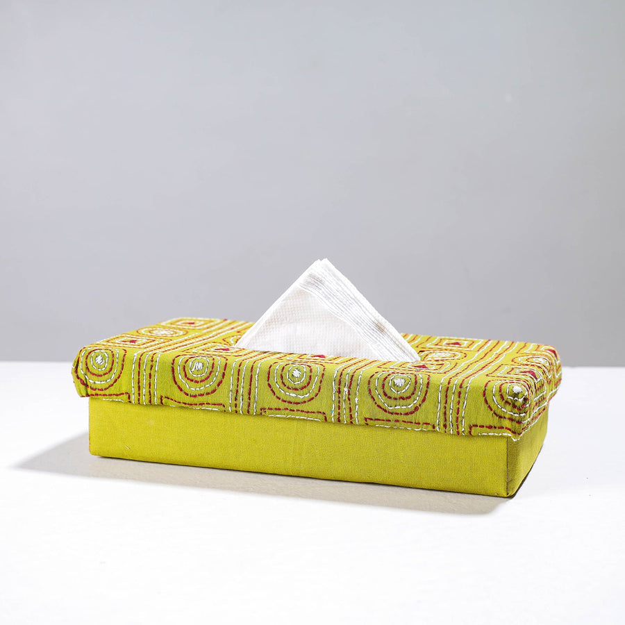 Fine quality, green handcrafted kantha-work tissue box from West Bengal. Made from hardboard, the box is lined with kantha work fabric. This tissue box is a beautiful and decorative box especially made for keeping tissues and paper napkins. Long lasting & sturdy material.