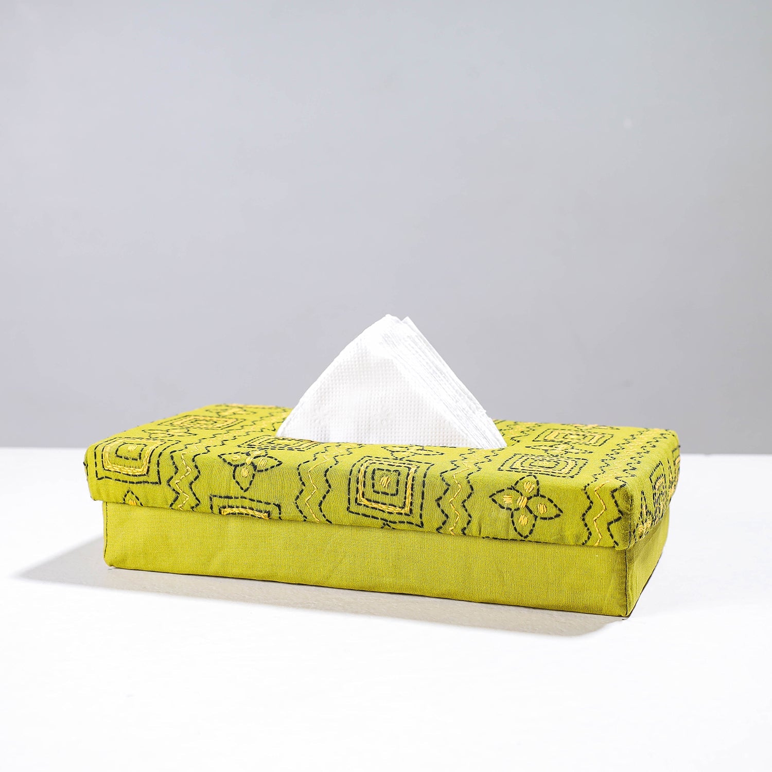 Fine quality, green handcrafted kantha-work tissue box from West Bengal. Made from hardboard, the box is lined with kantha work fabric. This tissue box is a beautiful and decorative box especially made for keeping tissues and paper napkins. Long lasting & sturdy material.