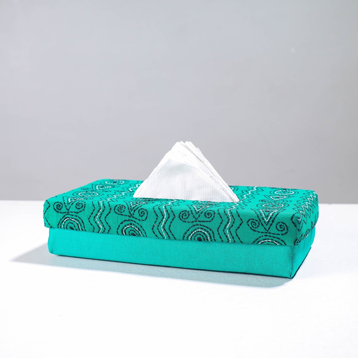 Fine quality, blue handcrafted kantha-work tissue box from West Bengal. Made from hardboard, the box is lined with kantha work fabric. This tissue box is a beautiful and decorative box especially made for keeping tissues and paper napkins. Long lasting & sturdy material.