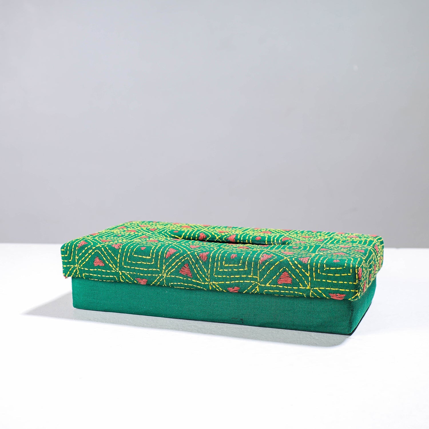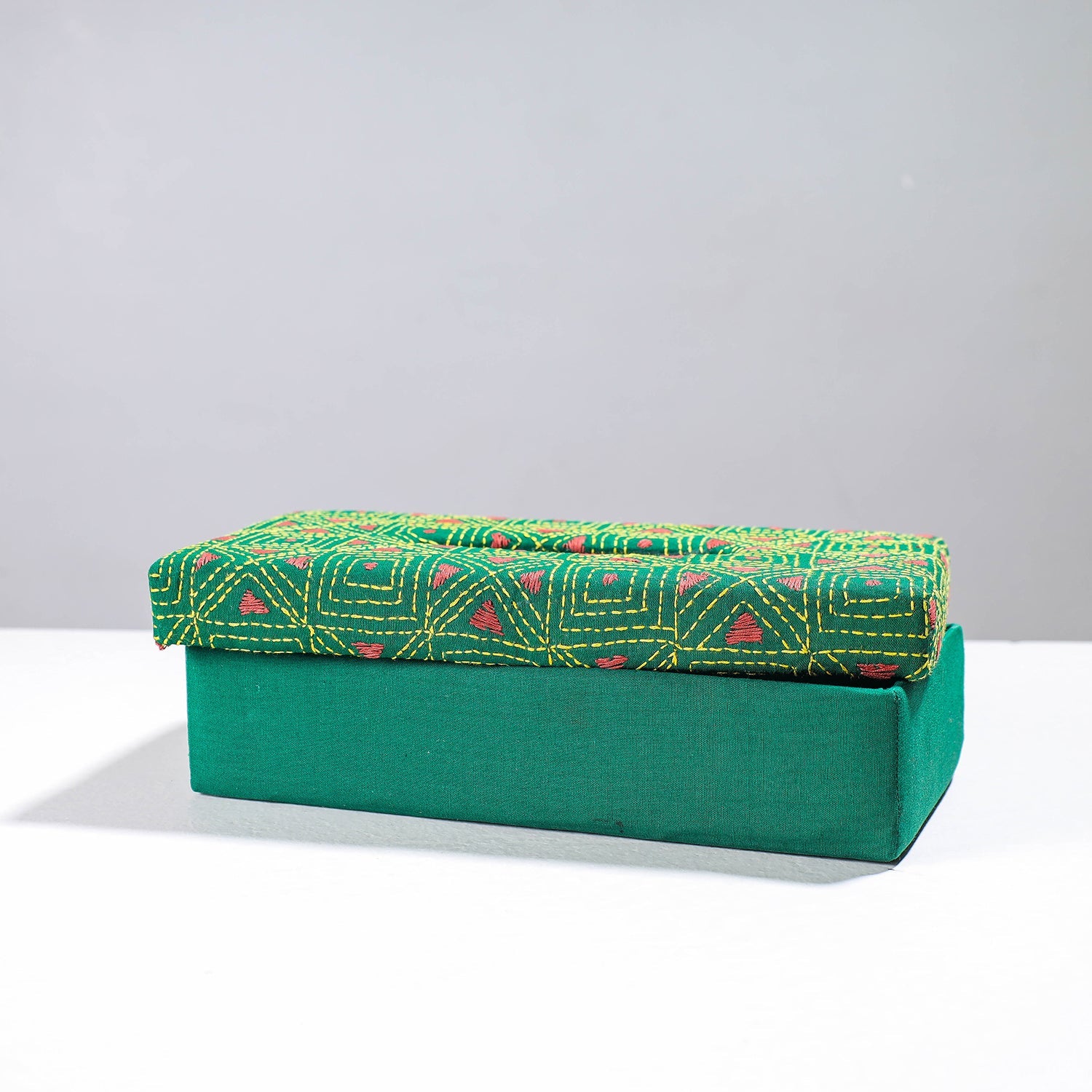 Fine quality, green handcrafted kantha-work tissue box from West Bengal. Made from hardboard, the box is lined with kantha work fabric. This tissue box is a beautiful and decorative box especially made for keeping tissues and paper napkins. Long lasting & sturdy material.