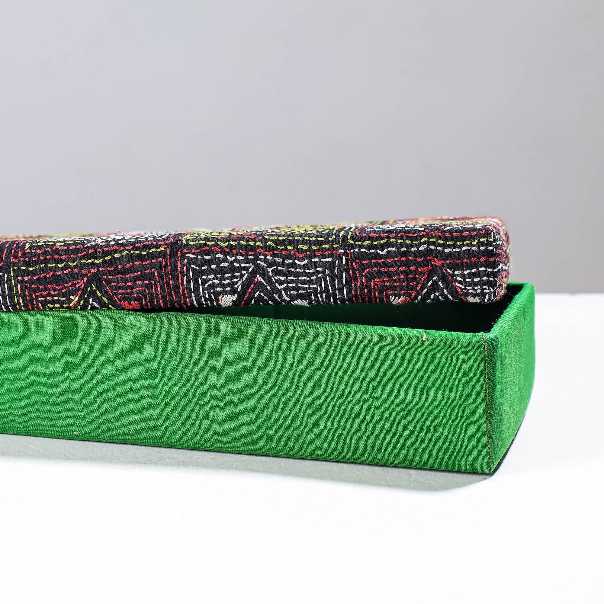 Fine quality, green handcrafted kantha-work tissue box from West Bengal. Made from hardboard, the box is lined with kantha work fabric. This tissue box is a beautiful and decorative box especially made for keeping tissues and paper napkins. Long lasting & sturdy material.