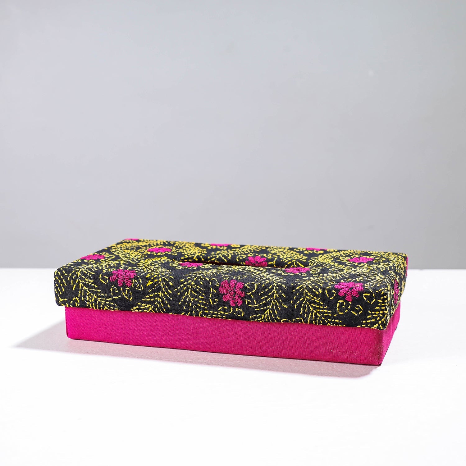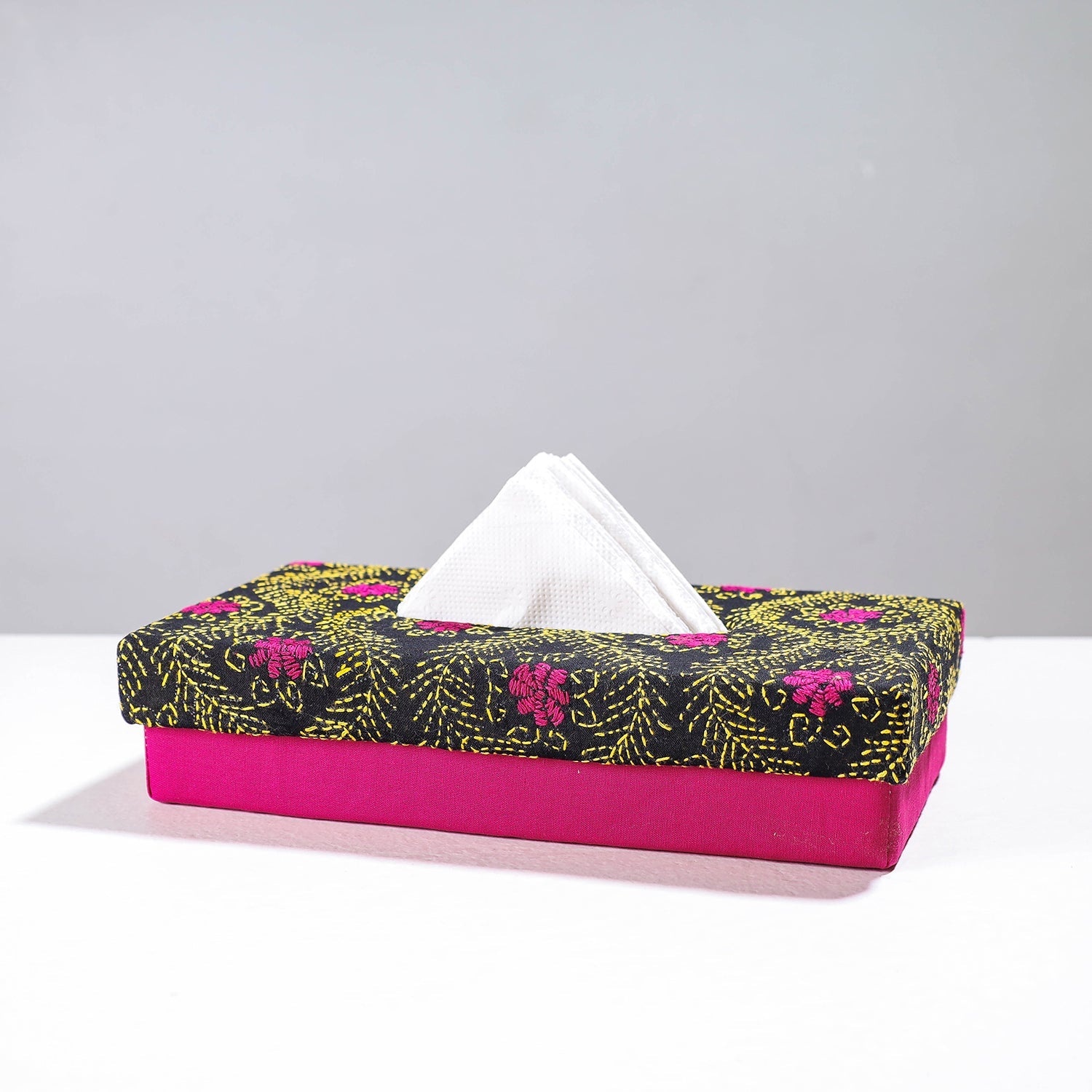 Fine quality, pink handcrafted kantha-work tissue box from West Bengal. Made from hardboard, the box is lined with kantha work fabric. This tissue box is a beautiful and decorative box especially made for keeping tissues and paper napkins. Long lasting & sturdy material.