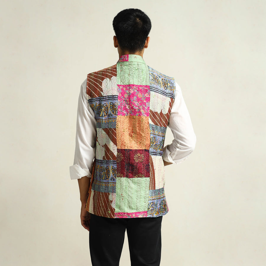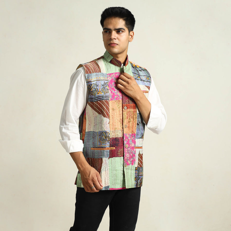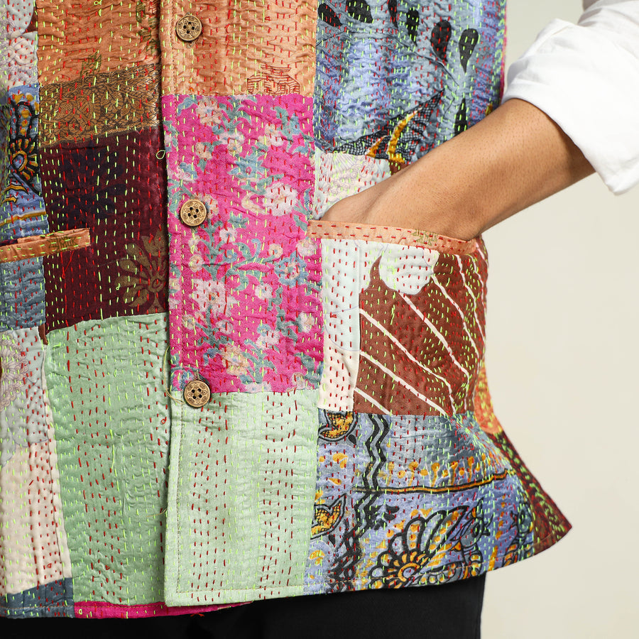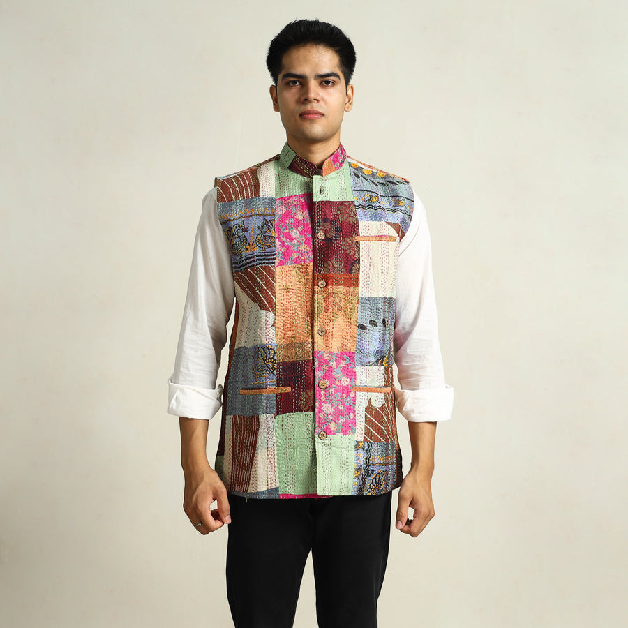 Look smart in this uniquely designed kantha embroidery silk patchwork nehru jacket with three outer pockets. It has a Chinese collar, sleeveless, full-button placket. This kantha embroidery patchwork nehru jacket is perfect for the festive mood and for a special occasion.