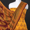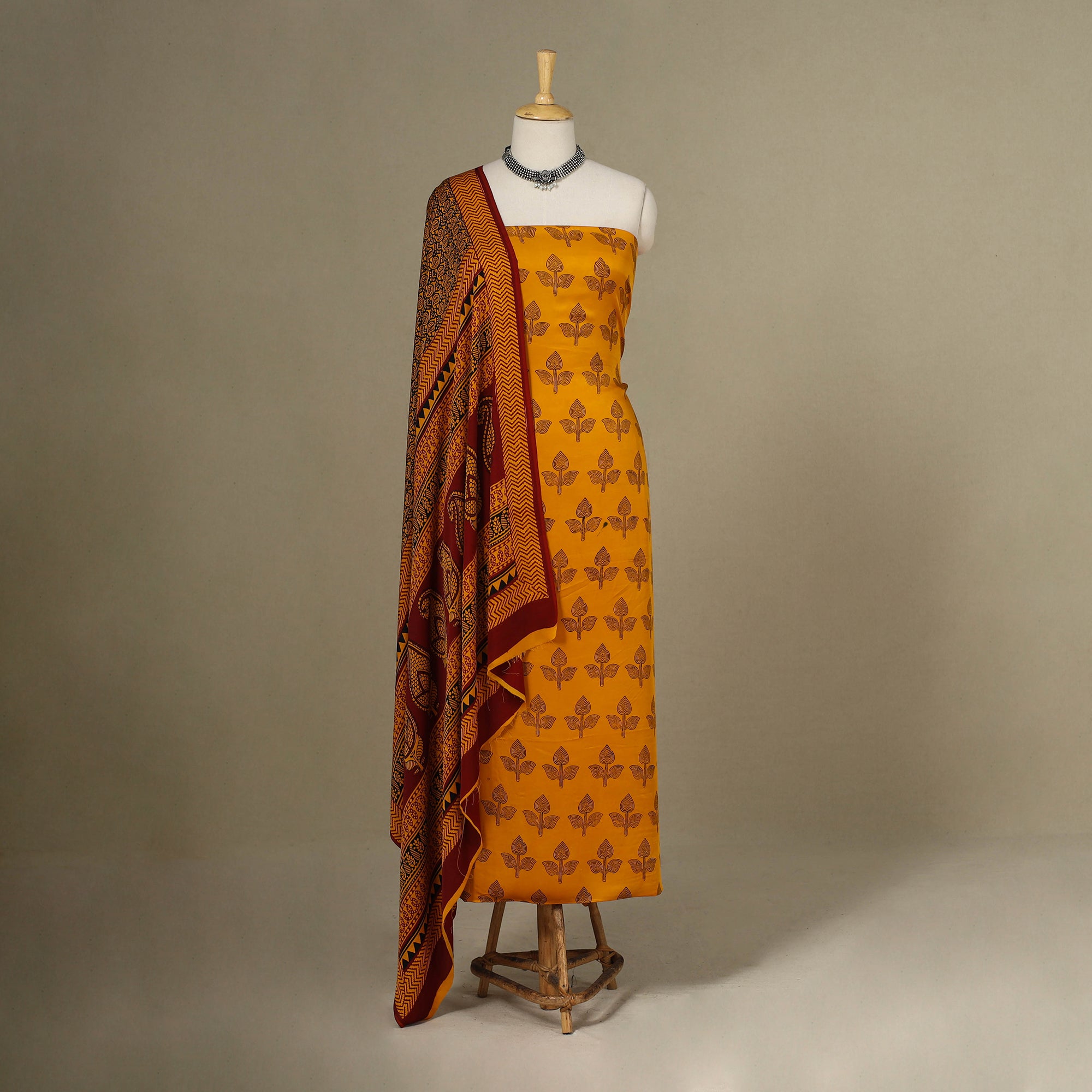 Fine quality yellow bagh block printed modal silk 3pc suit material set, made using traditional process of hand block printing by Umar Faruk Khatri practiced in Bagh, the Dhar district of Madhya Pradesh. Modal silk is a soft, shiny and highly lustrous fabric, achieved through interlacing modal fibers and silk yarns. it has opulence of silk and the comfort of cotton modal is a fine and soft textured weave.