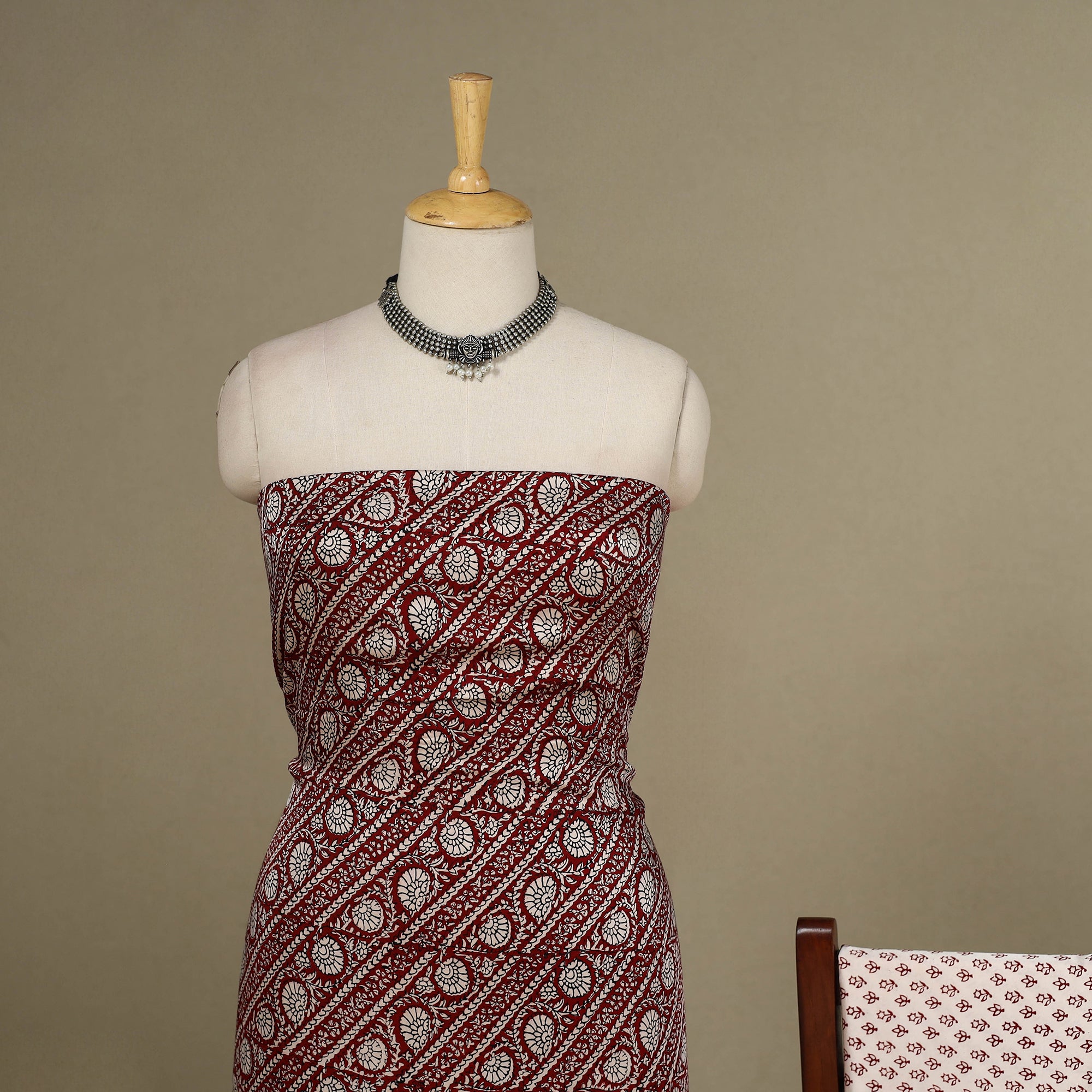 Fine quality maroon bagh block printed modal silk 3pc suit material set, made using traditional process of hand block printing by Umar Faruk Khatri practiced in Bagh, the Dhar district of Madhya Pradesh. Modal silk is a soft, shiny and highly lustrous fabric, achieved through interlacing modal fibers and silk yarns. it has opulence of silk and the comfort of cotton modal is a fine and soft textured weave.