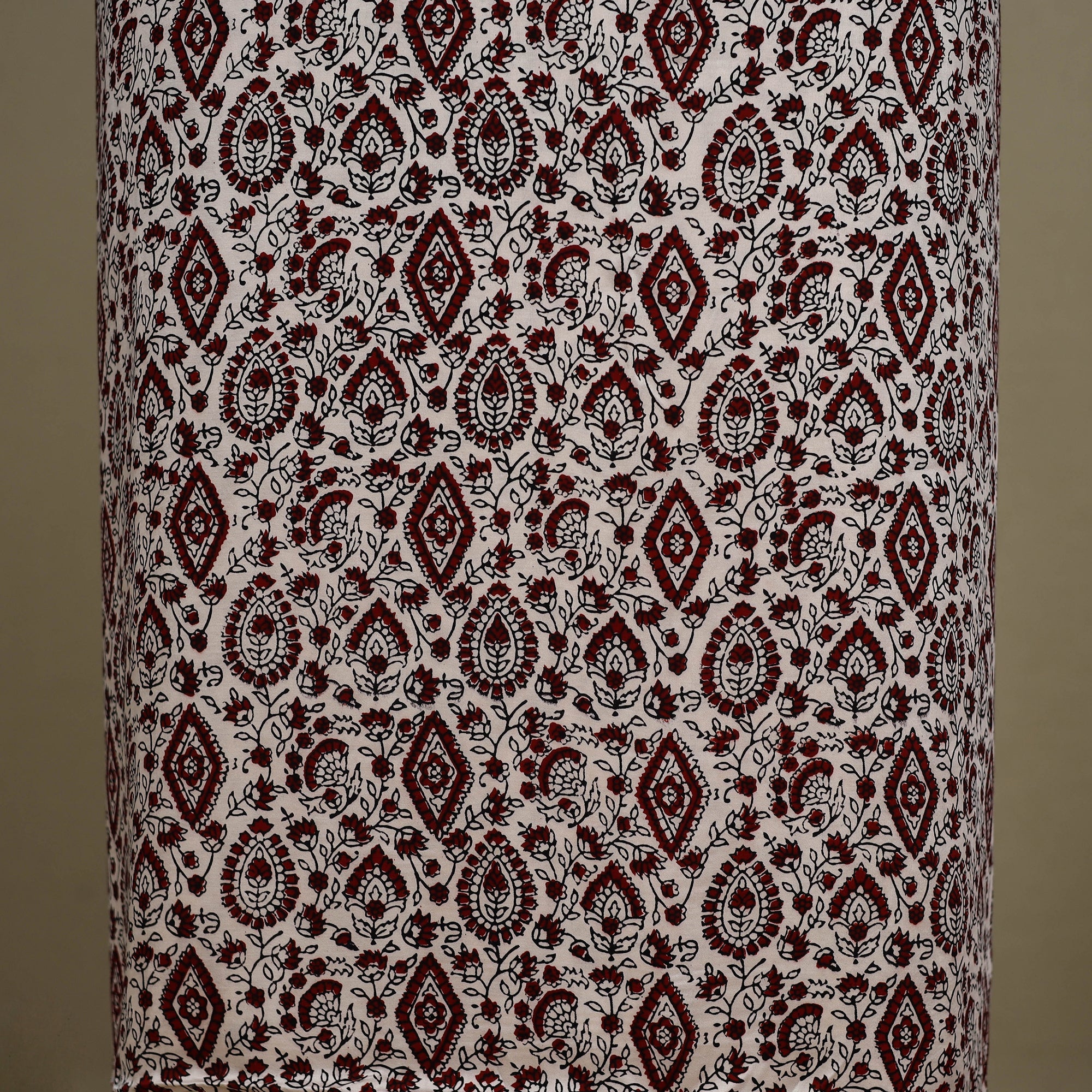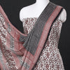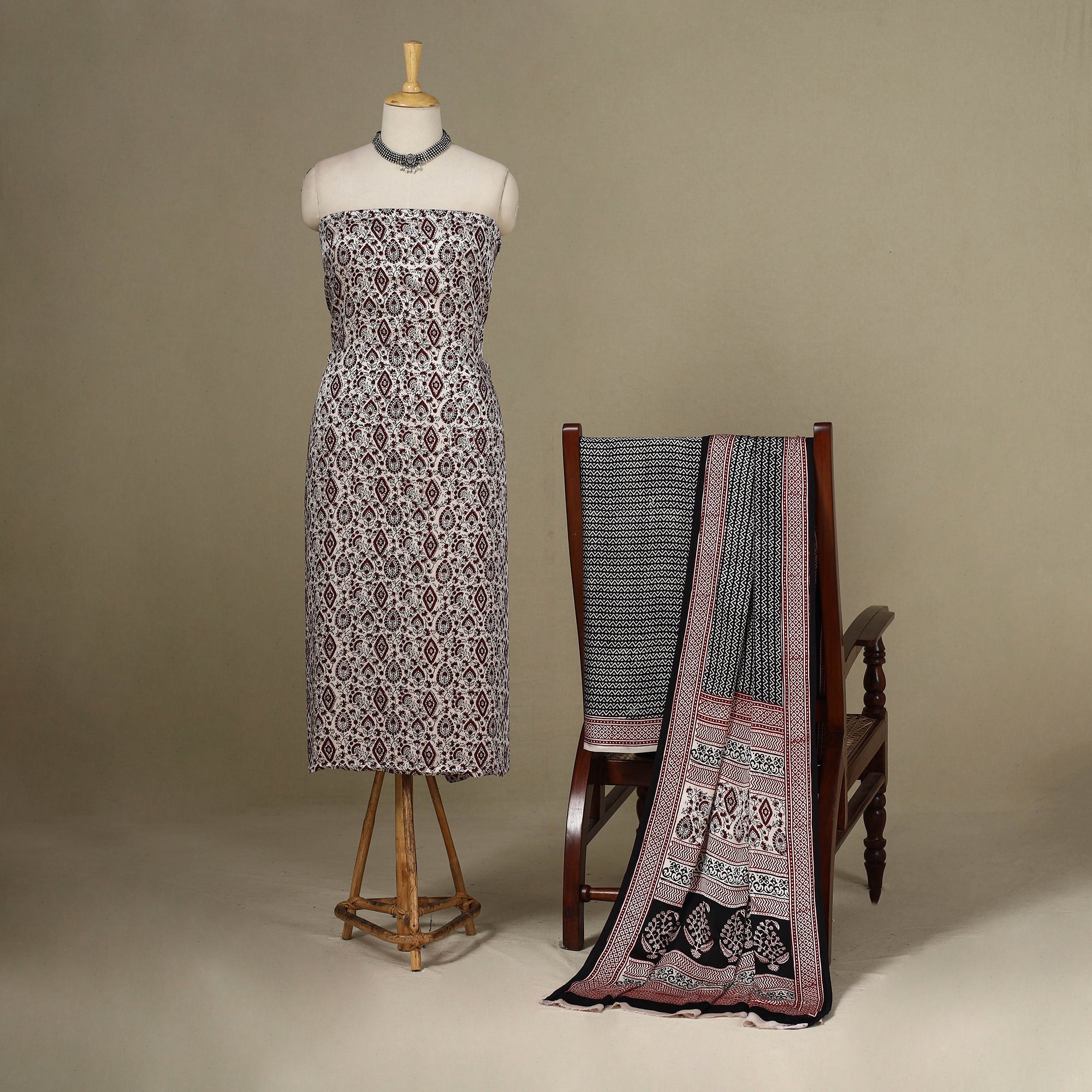 Fine quality beige bagh block printed modal silk 3pc suit material set, made using traditional process of hand block printing by Umar Faruk Khatri practiced in Bagh, the Dhar district of Madhya Pradesh.