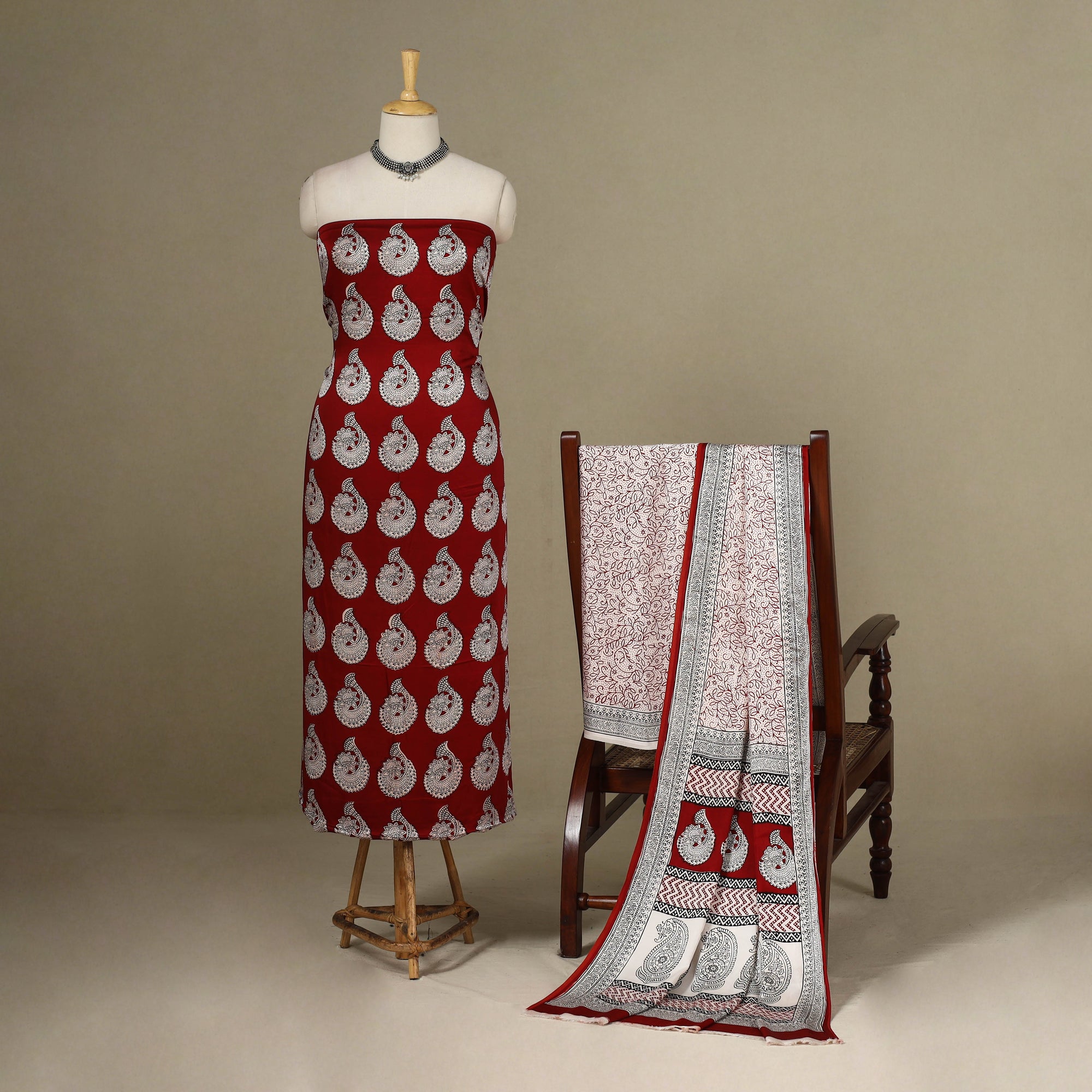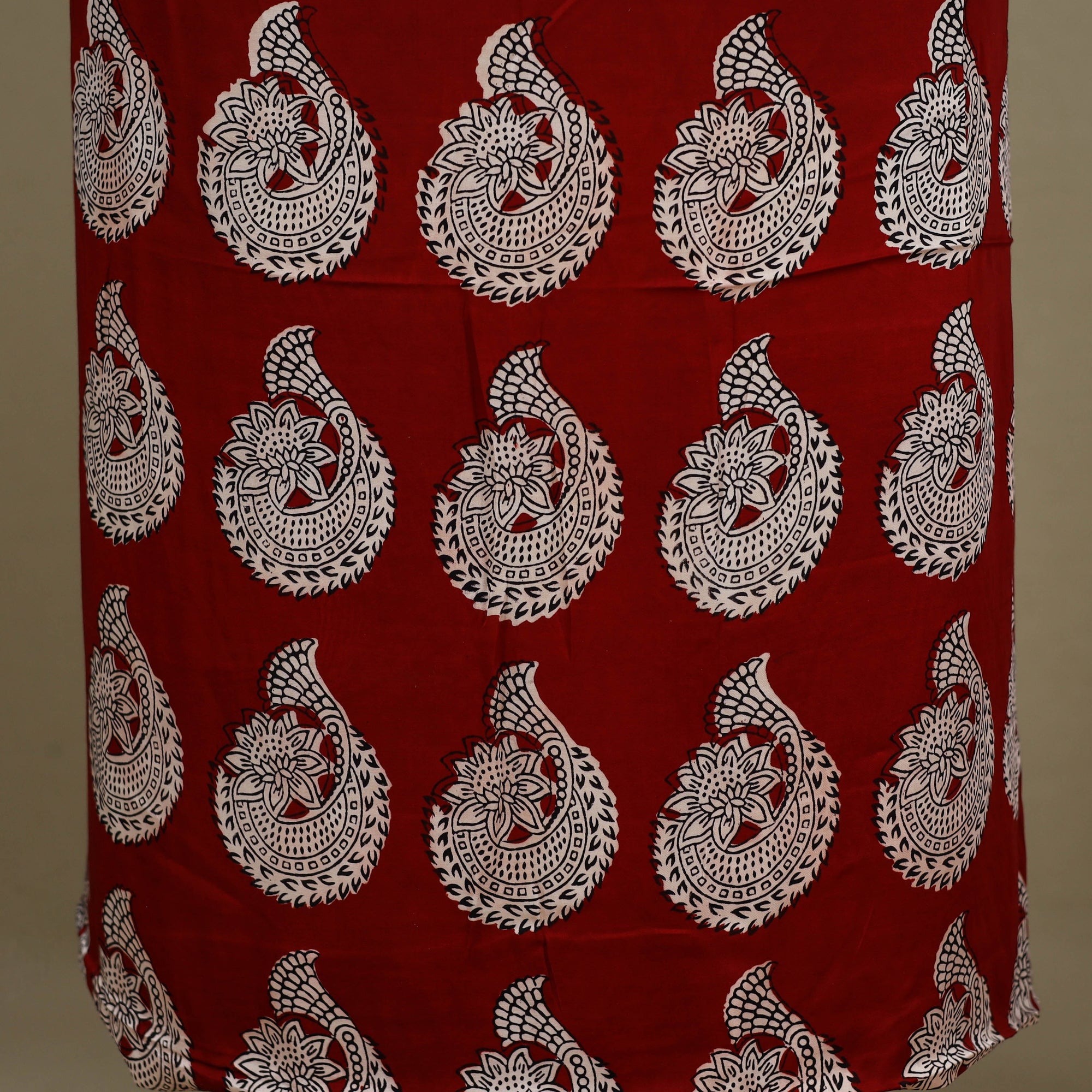 Fine quality maroon bagh block printed modal silk 3pc suit material set, made using traditional process of hand block printing by Umar Faruk Khatri practiced in Bagh, the Dhar district of Madhya Pradesh. Modal silk is a soft, shiny and highly lustrous fabric, achieved through interlacing modal fibers and silk yarns. it has opulence of silk and the comfort of cotton modal is a fine and soft textured weave.