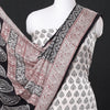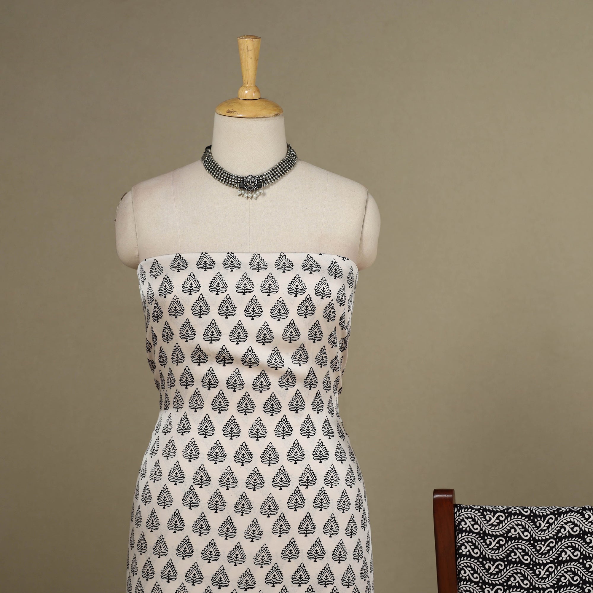 Fine quality white bagh block printed modal silk 3pc suit material set, made using traditional process of hand block printing by Umar Faruk Khatri practiced in Bagh, the Dhar district of Madhya Pradesh. Modal silk is a soft, shiny and highly lustrous fabric, achieved through interlacing modal fibers and silk yarns. it has opulence of silk and the comfort of cotton modal is a fine and soft textured weave.