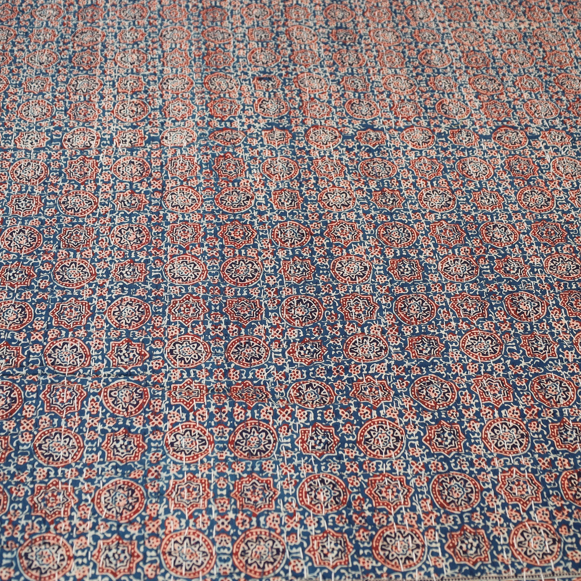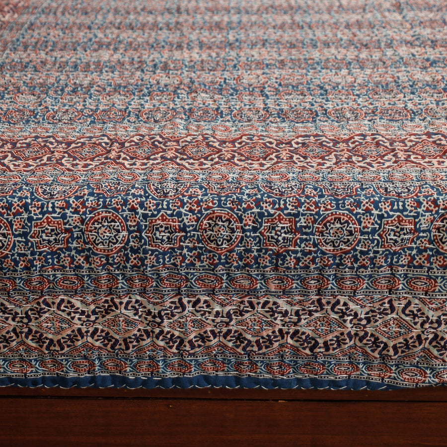 Fine quality ajrakh block printing double bedcover with kantha embroidery made using natural dyes through traditional process of hand block printing practised by the master artisans in Barmer, Rajasthan.