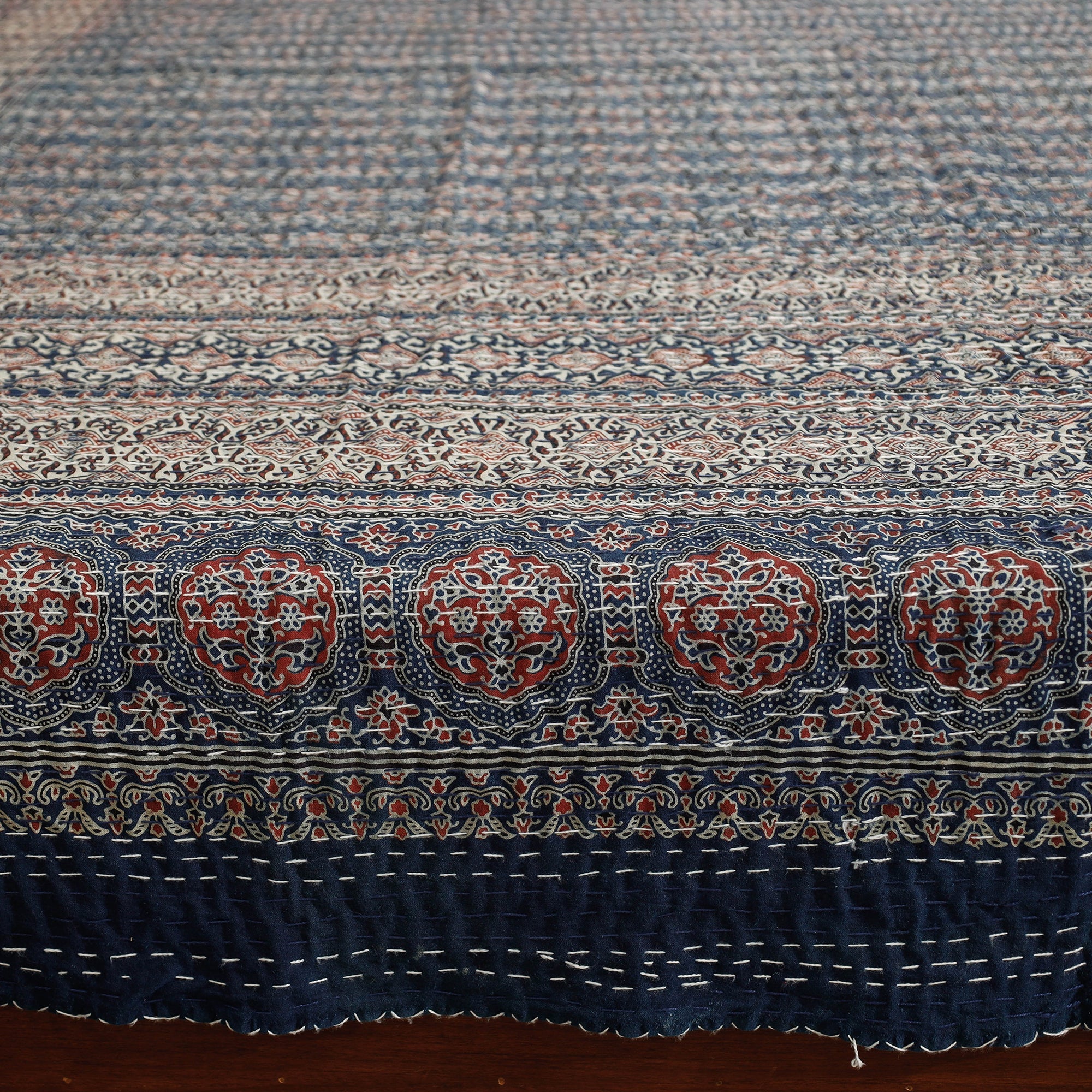 Fine quality ajrakh block printing double bedcover with kantha embroidery made using natural dyes through traditional process of hand block printing practised by the master artisans in Barmer, Rajasthan.