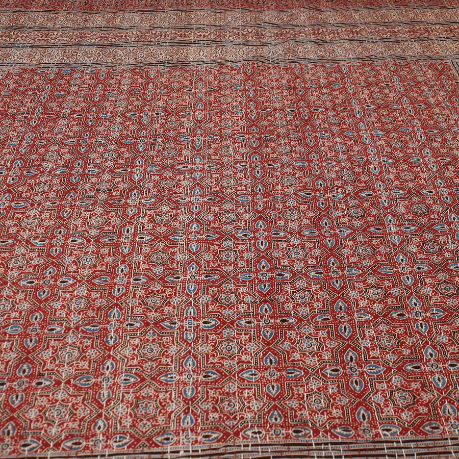 Fine quality ajrakh block printing double bedcover with kantha embroidery made using natural dyes through traditional process of hand block printing practised by the master artisans in Barmer, Rajasthan.