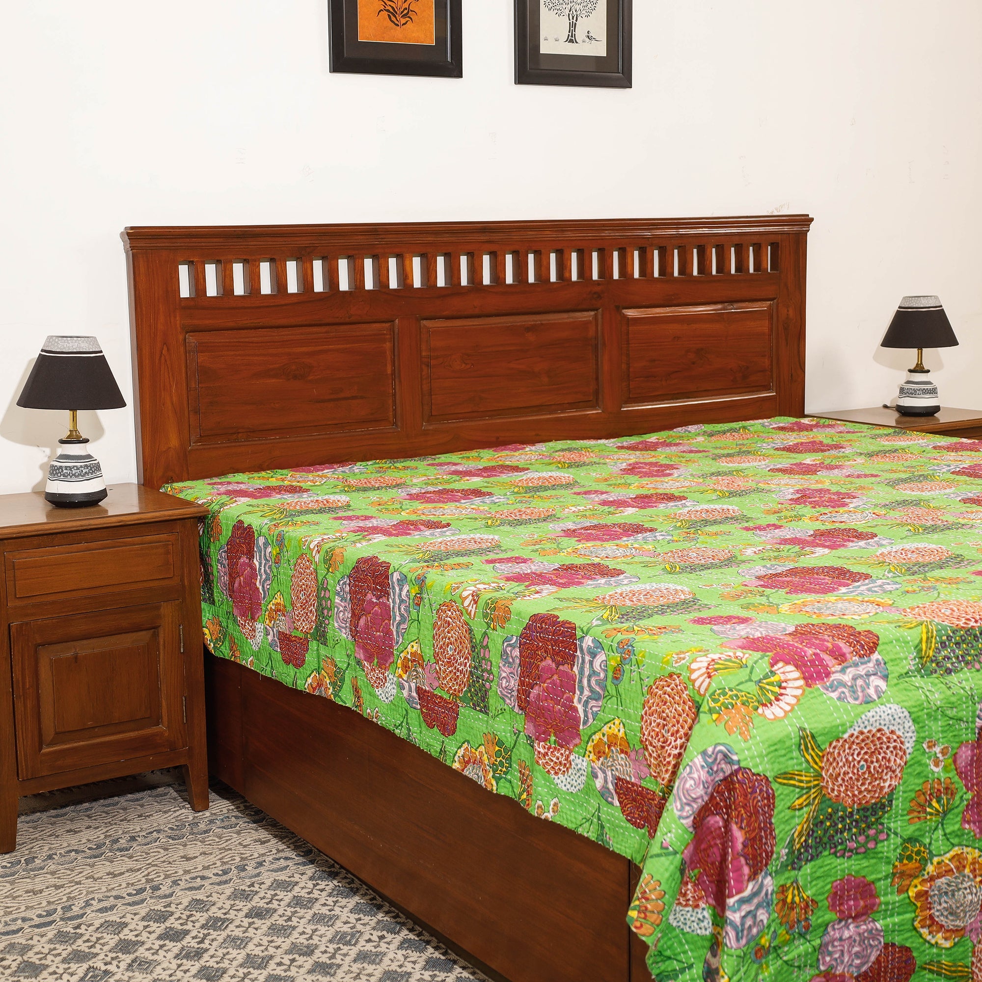 Fine quality sanganeri block printing cotton double bedcover with kantha embroidery made using natural dyes through traditional process of hand block printing practised by the master artisans in Barmer, Rajasthan.