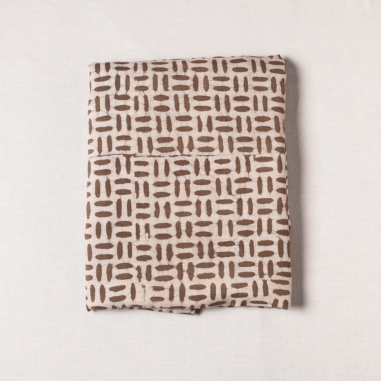 Fine quality brown pipad hand block printed mulberry silk-cotton handloom precut fabric. This fabric is made from mulberry silk and cotton blend and dyed using natural dyes through a traditional mud resist process by Chhipa Azhar practiced in Pipar, Rajasthan. This material is produced sustainably on an organic mulberry plantation. There are no chemicals used. The cocoons are hand reared, handspun, and hand-woven. The warp is double taani, and the weft is double bharni. The loom is a pit loom. The plantation is in Katihar, Bihar; handspun in Malda; and handwoven in Margram.